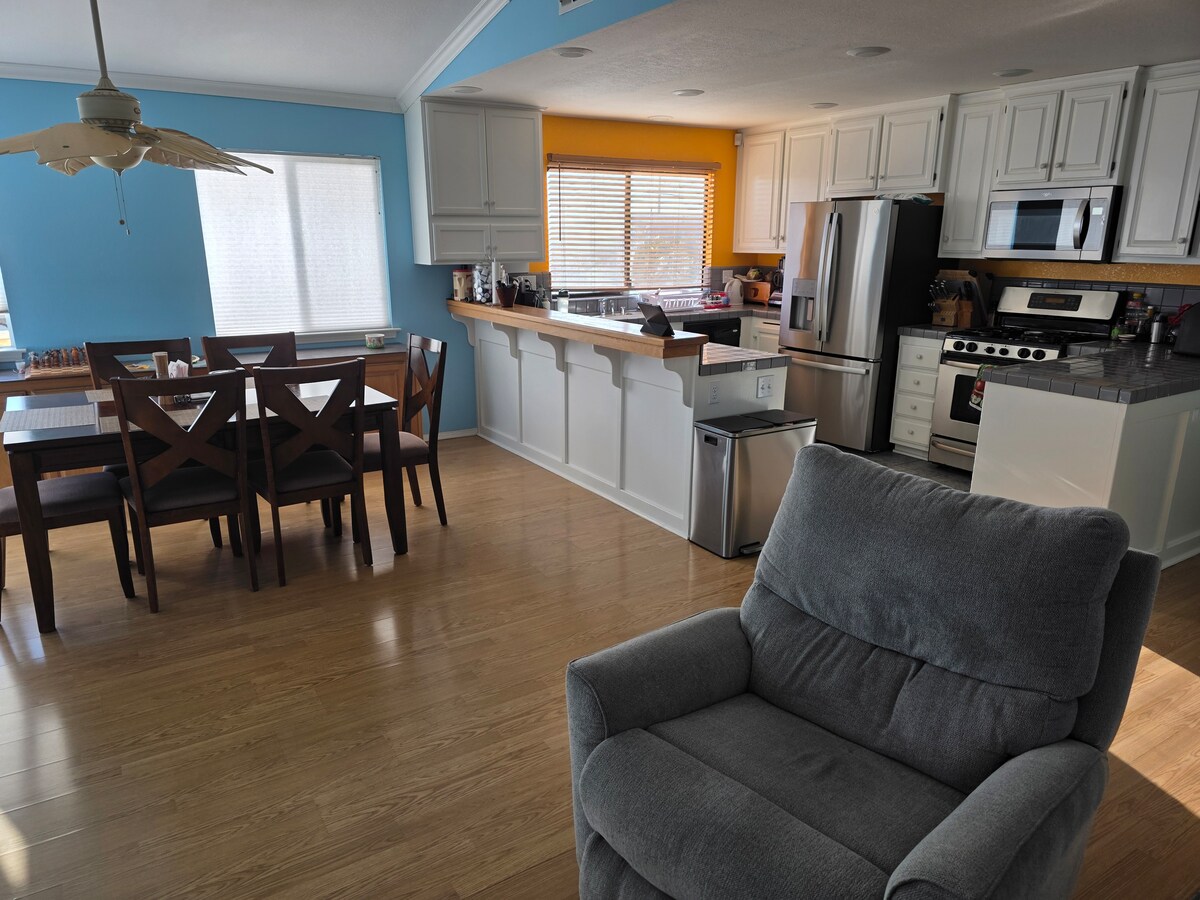 Enjoy a relaxing, carefree vacation. Our remodeled two-story home features a spacious great room, which includes a chef’s kitchen, dining area and living room. The living room is furnished with a 6 foot couch and a 42 inch LCD TV with a Blu-Ray player. Hardwood floors and multiple, expansive windows embellish the sense of space in the great room.