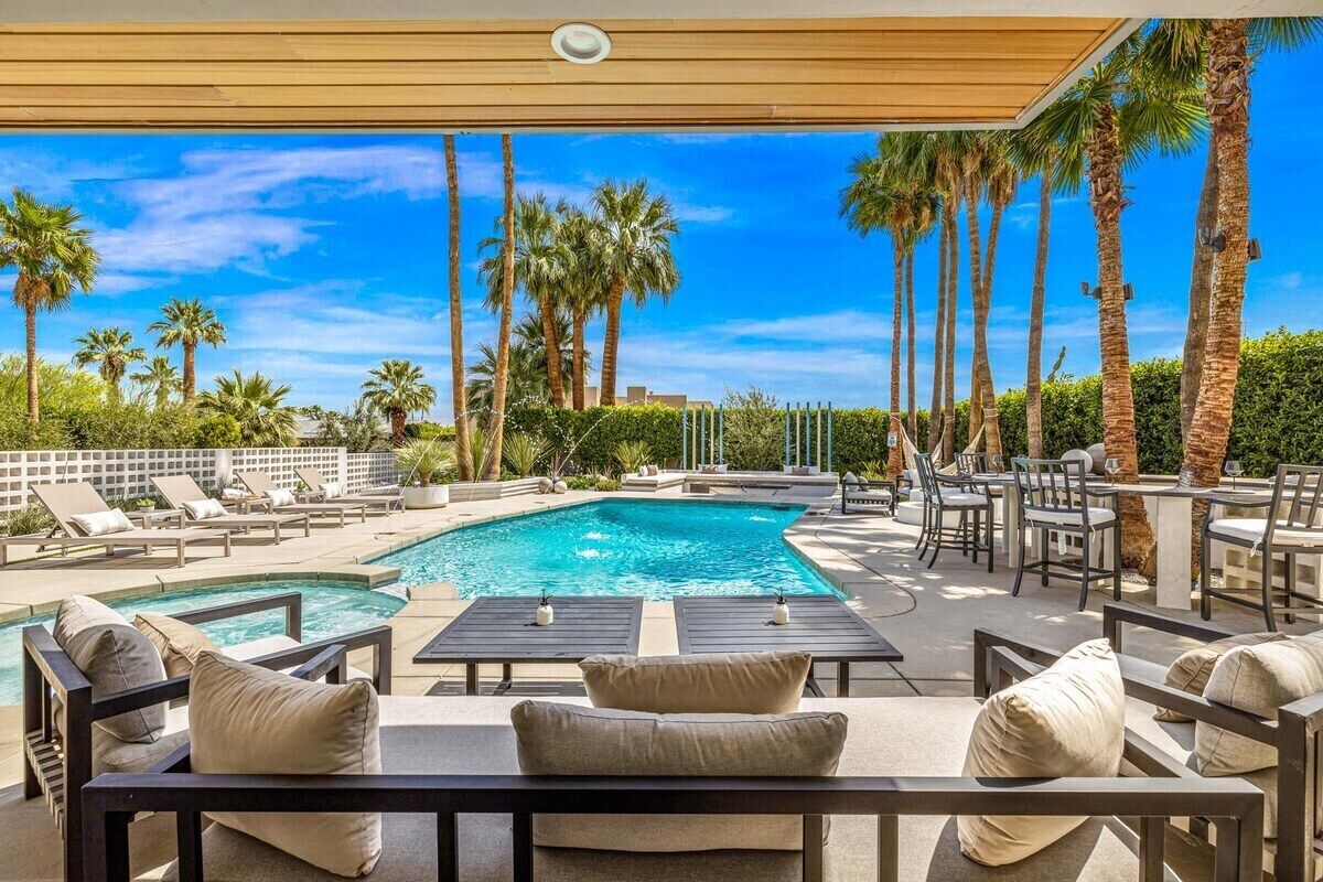 The indoor and outdoor spaces seamlessly blend so guests can meander from the main level great room out to the expansive outdoor living area with a private pool, hot tub, and much more. This pristine home offers 4 bedrooms 3 and 1 1/2 baths, and can comfortably sleep up to 8 adults. This tranquil desert escape places you close to the vibrant culture and area events, plus is equipped with everything you need to enjoy the best of sunny Palm Springs.