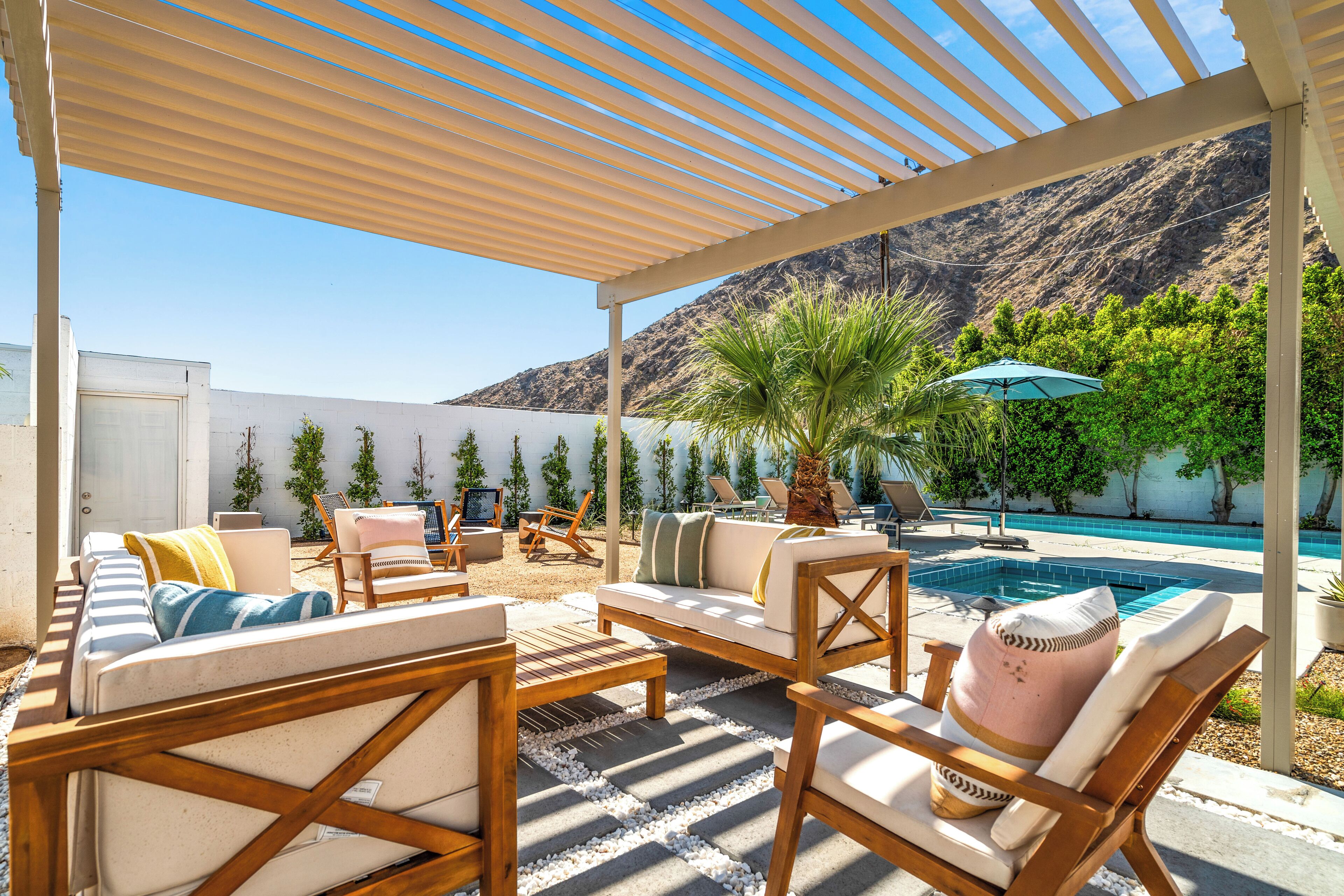 The fabulous backyard was made for relaxing in the Palm Springs sunshine. It features a large pool at the center of the yard with an integrated waterfall spa surrounded by chaise lounges and plenty of occasional seating. You’ll also find alfresco dining for up to 8, a built-in bar, a BBQ grill, an outdoor lounge area, and a firepit lounge. There’s also cornhole and Connect 4. It's the perfect place for a relaxing getaway, and the mountain and city views are absolutely spectacular!