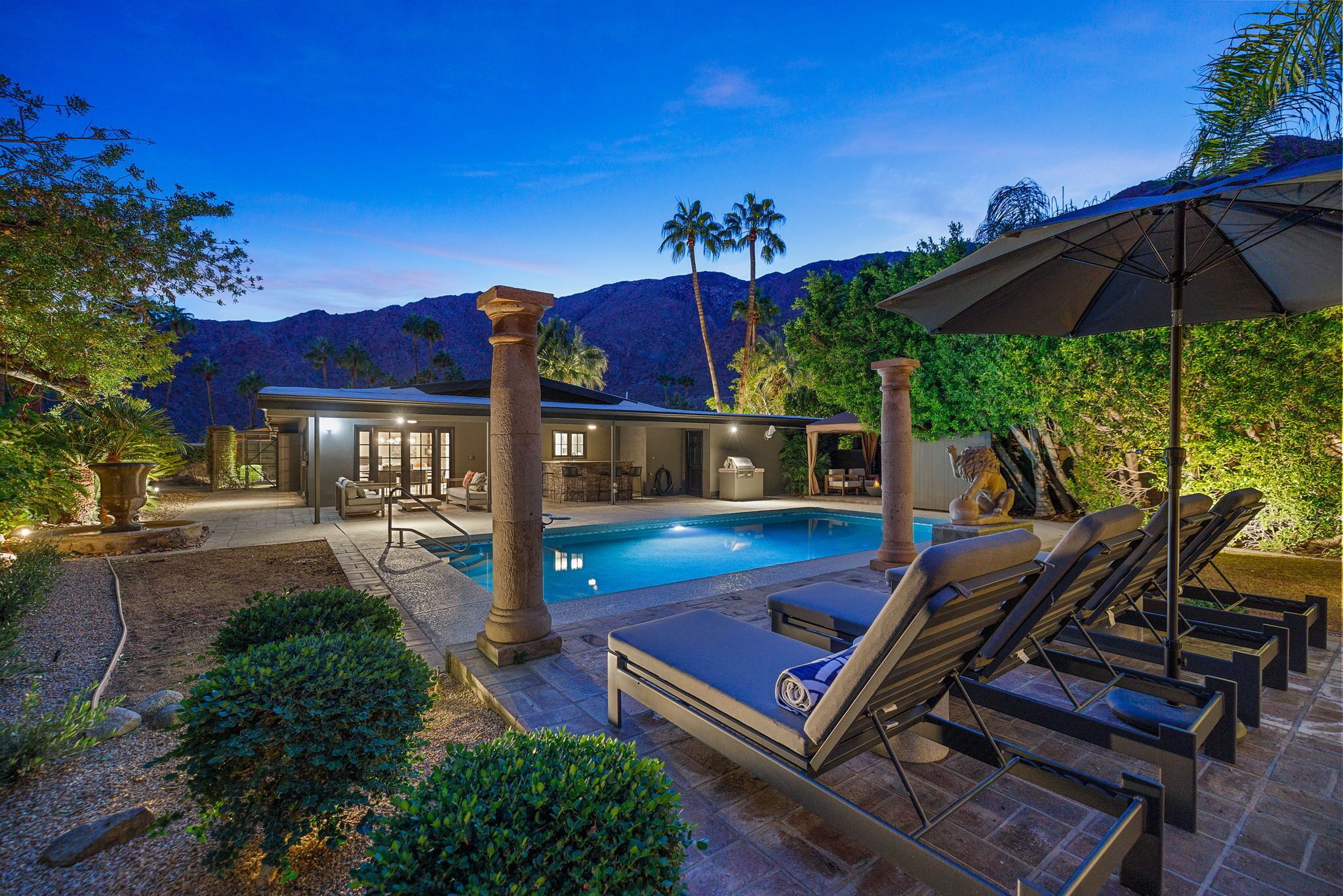 Breathtaking home in Tuscany Heights with one of the most beautiful mountain backdrops you'll ever see. Featuring a custom pool with cascading waterfall from an elevated spa. Extremely private and set up against the mountains - without a house behind you to obstruct the awesome view. Multiple private areas to relax and enjoy - a hammock, outdoor shower, firepit lounge that is cleverly built into the rocks and outdoor kitchen and dining areas. 3400 square foot open concept floor plan with a spacious great room and kitchen combo that takes full advantage of the spectacular views. 3 luxury bedroom suites, all with exterior entrances and mountain views. If you do decide to leave your peaceful retreat, downtown Palm Springs and all the fun of Palm Canyon Drive are just a few minutes away!
