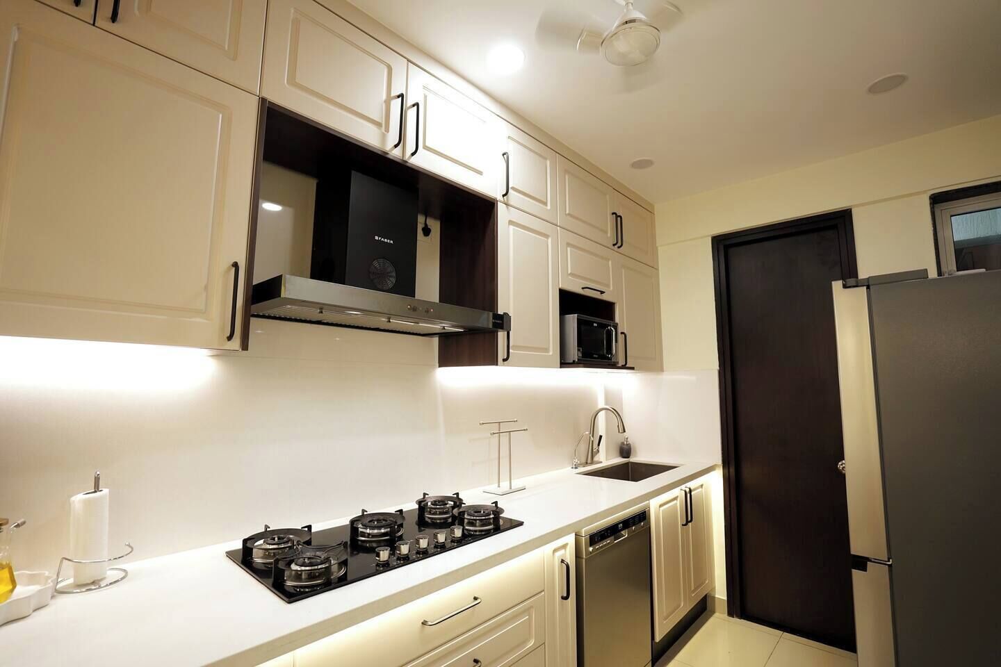 Calling all foodies! Our kitchen is fully equipped with modern amenities to inspire your inner chef. Whip up delicious meals with the in-built gas hob, chimney, sparkling quartz countertops, and a deep sink with hot water on demand. Plus, enjoy the convenience of a dishwasher, microwave with grill, RO drinking water system, and refrigerator.