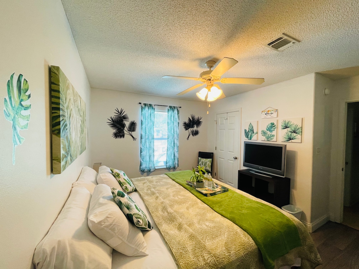 The room faces the back of the house and has direct pool access, private entrance & full bathroom for guests only. Bedroom has a king size bed and plenty amenities.