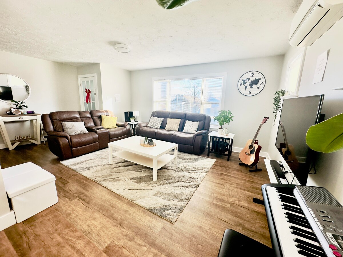 The living room amenities are 1 - 3 seater reclining sofa, projector, refrigerator, free channels, tubi movies, Roku, YouTube. 1 coffee table with microwave, Tim Hortons coffee, tea bags, hot water kettle, drinking water, cups, plates, heat pump and ac, backup heat board, and a laptop desk.