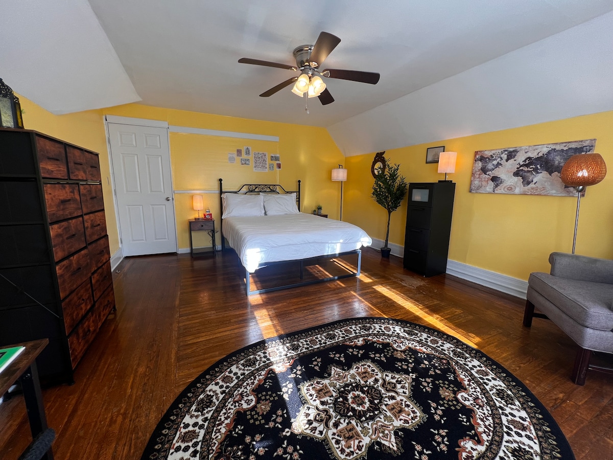 3rd floor attic room with AC, Queen bed located at the back of the house. Oak Room has a ductless split AC/Heat System