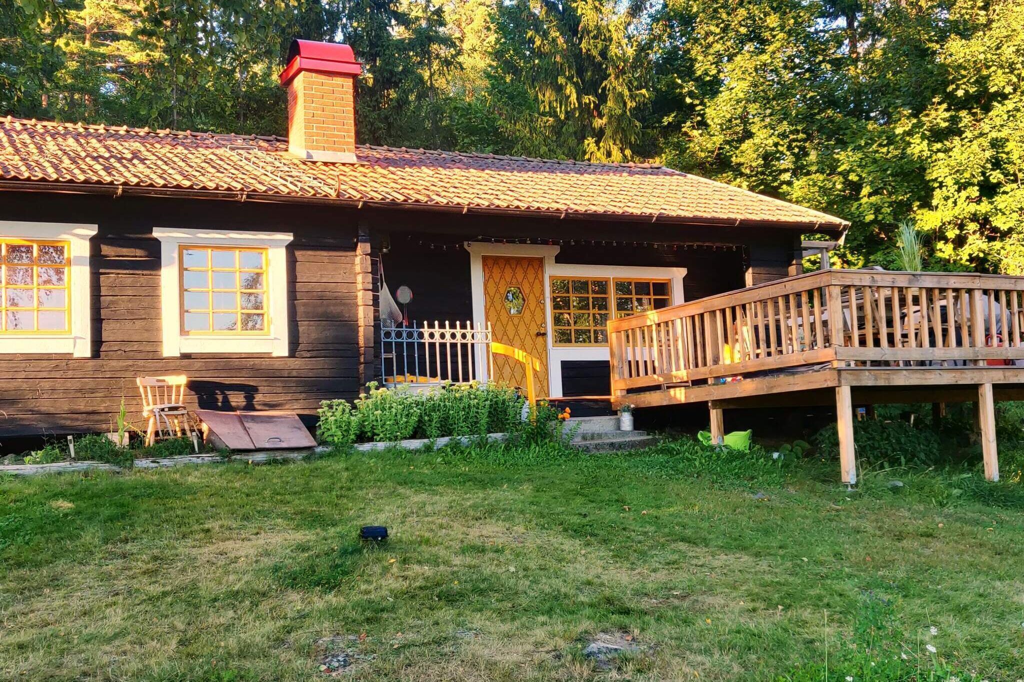 "Bengtstorp", 3-room house 58 m2. Cosy and wooden furniture furnishings: living/dining room with open-hearth fireplace, dining table, TV, hi-fi system and DVD. Exit to the terrace. 1 room with 2 beds. 1 room with 1 beds and 1 x 2 bunk beds. Open kitchen (oven, 4 induction hot plates, microwave, freezer, electric coffee machine) with dining table. Shower/WC. Heating, air-conditioning, forced-air heating. Wooden floors. Terrace partly roofed, patio. Terrace furniture, barbecue (portable). View of the lake. Facilities: washing machine, iron. Please note: non-smoking house. Smoke alarm, fire extinguisher. Freezer approx. 80 l.