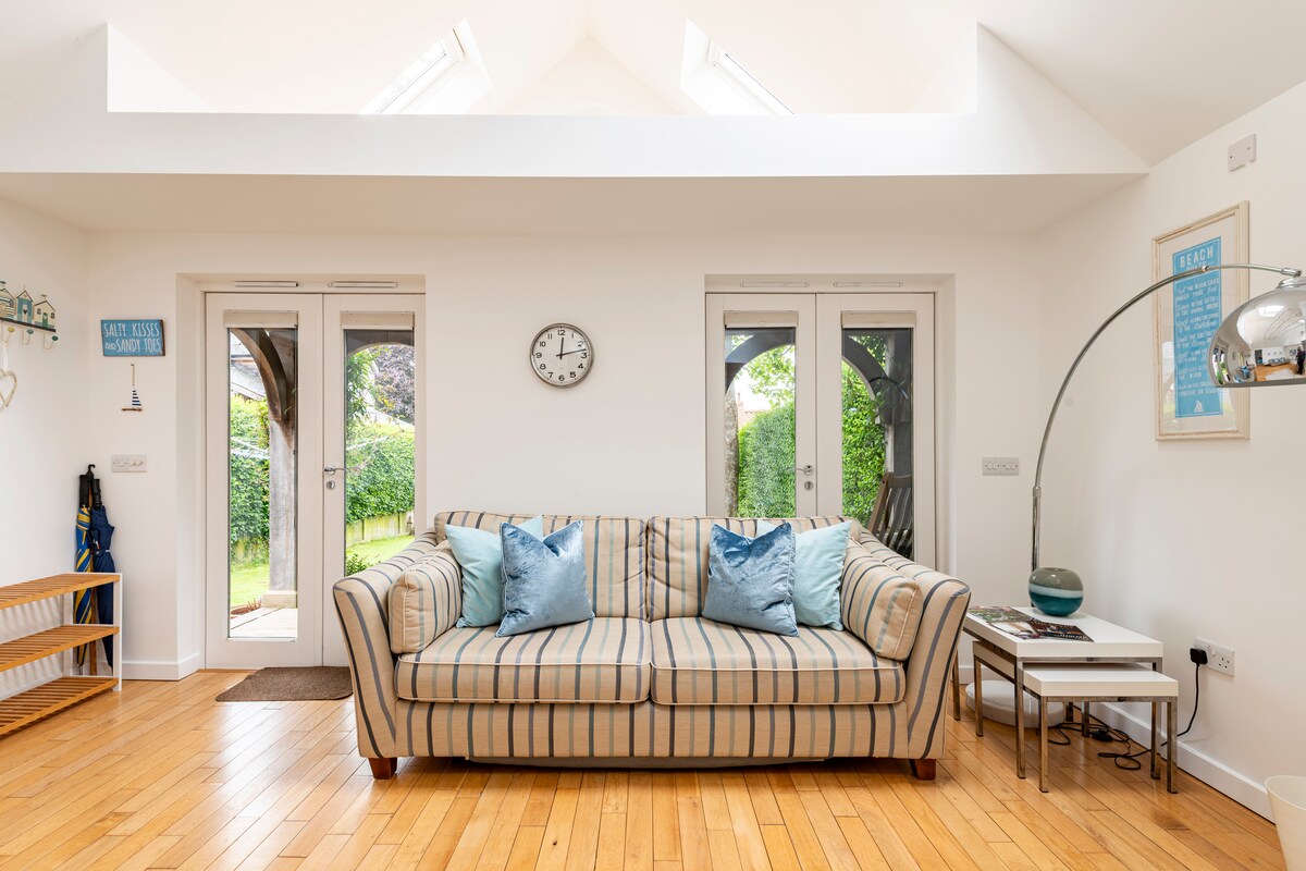 The living room and kitchen area is bright, comfortable, and great for socialising. There is a sofa which converts to a bed on request (with an extra person charge of £10 per person per night). There is also a large wall mounted smart television with Netflix, Amazon Prime, and BBC iPlayer services to name a few.