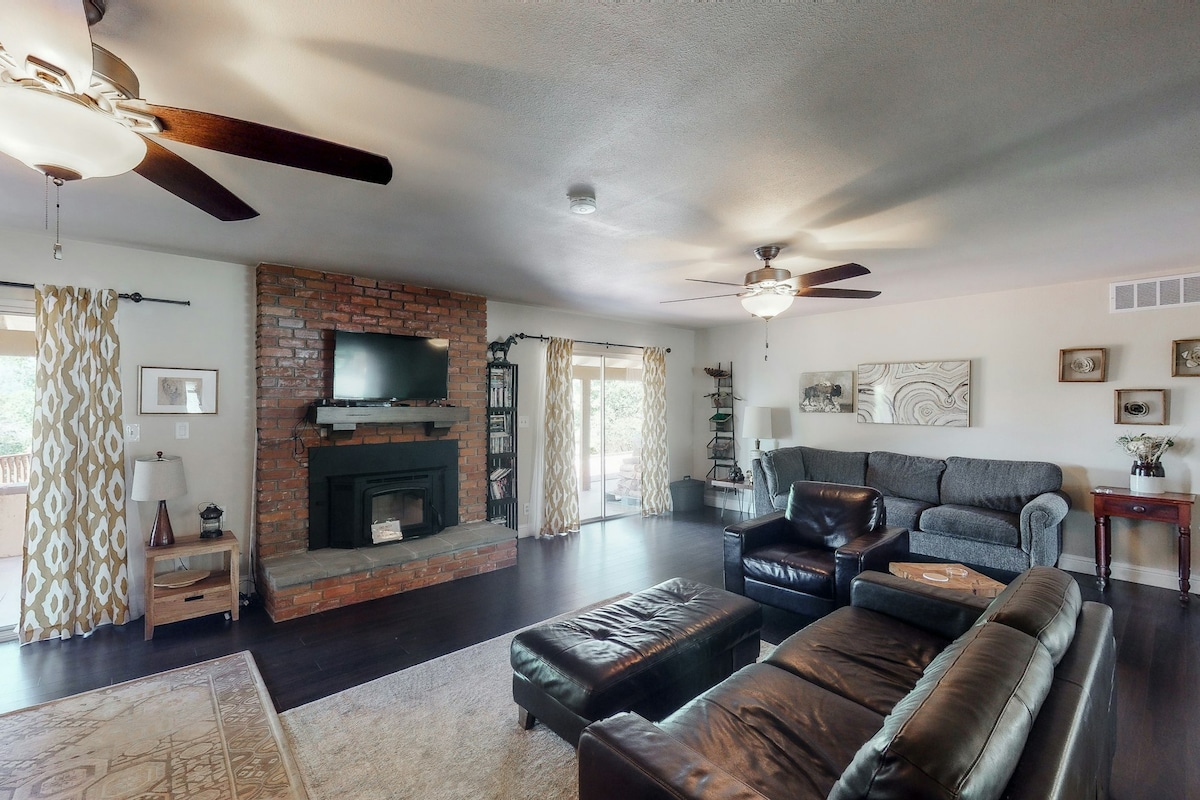 Rustic charm and modern comfort abound throughout the single-floor interior. Featuring stone backsplash and rock accent walls, the updated kitchen includes all the major appliances, cookware, and utensils for at-home meal planning, plus a dishwasher for stress-free cleanup. A sofa lounge and bar seating for two offers a comfortable spot to keep the home chef company in the kitchen while meals are prepared. When it's time to eat, the indoor dining table can accommodate up to six. End each day cozied up around the living room fireplace while streaming shows and movies on the smart TV. Additional perks include central air-conditioning, free WiFi, and a private washer/dryer.