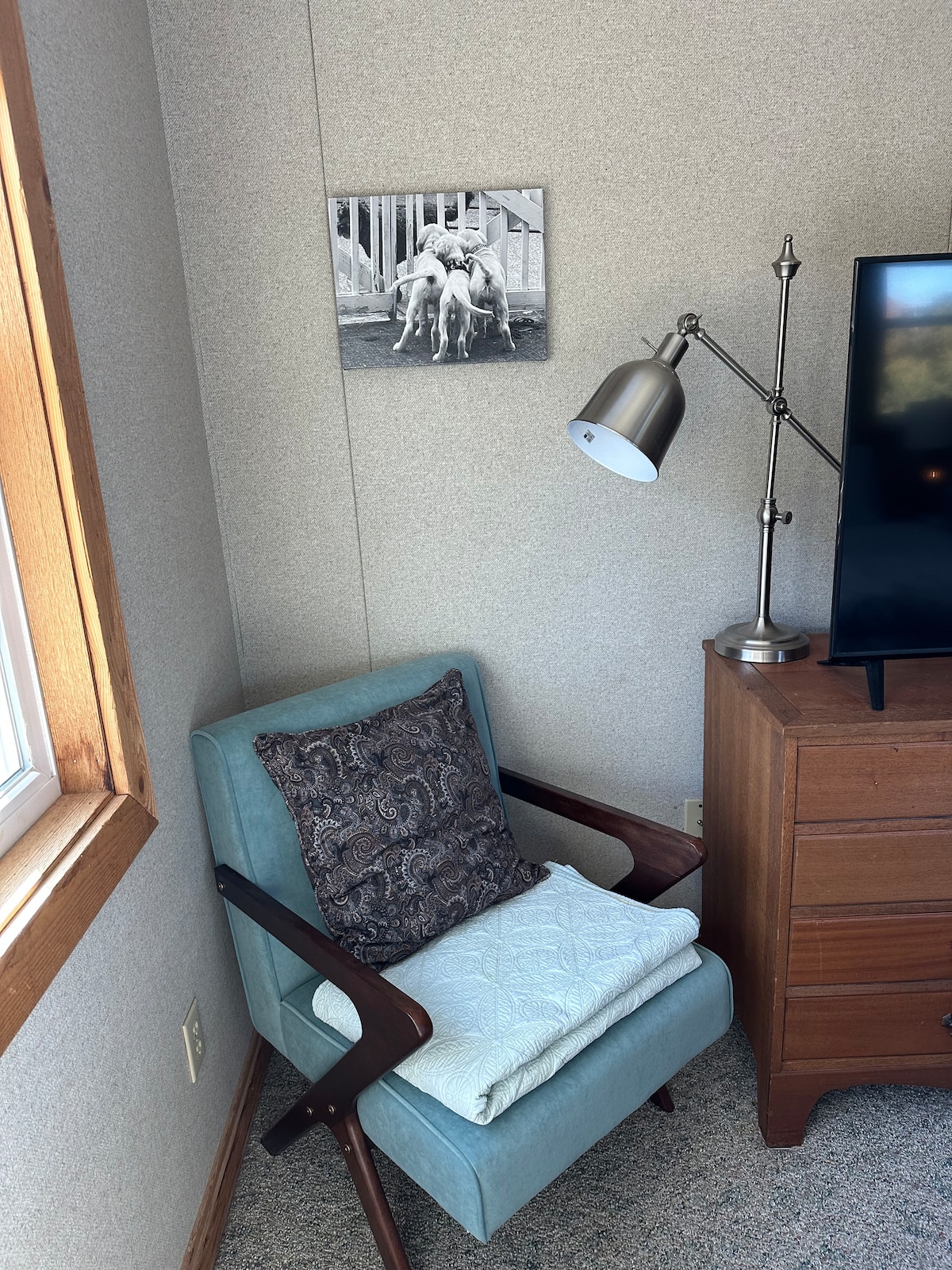 The open floorplan seamlessly connects the living room to the kitchen area. The kitchenette is fully equipped with a keurig machine with coffee and tea provided, a small full sized refrigerator and an electric skillet to cook meals with. Dishes have been provided along with utensils we feel everyone needs. There is no oven or stove top in this unit.