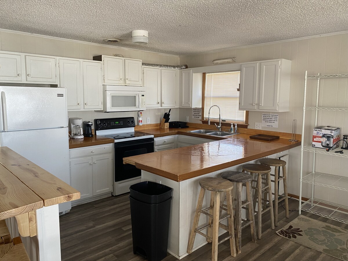 Kitchenette: full refrigerator/freezer, microwave, toaster oven, coffee maker, electric kettle, dual hot plate, electric skillet, pots/pans, dishes, utensils, etc. (Propane grill available in backyard.)