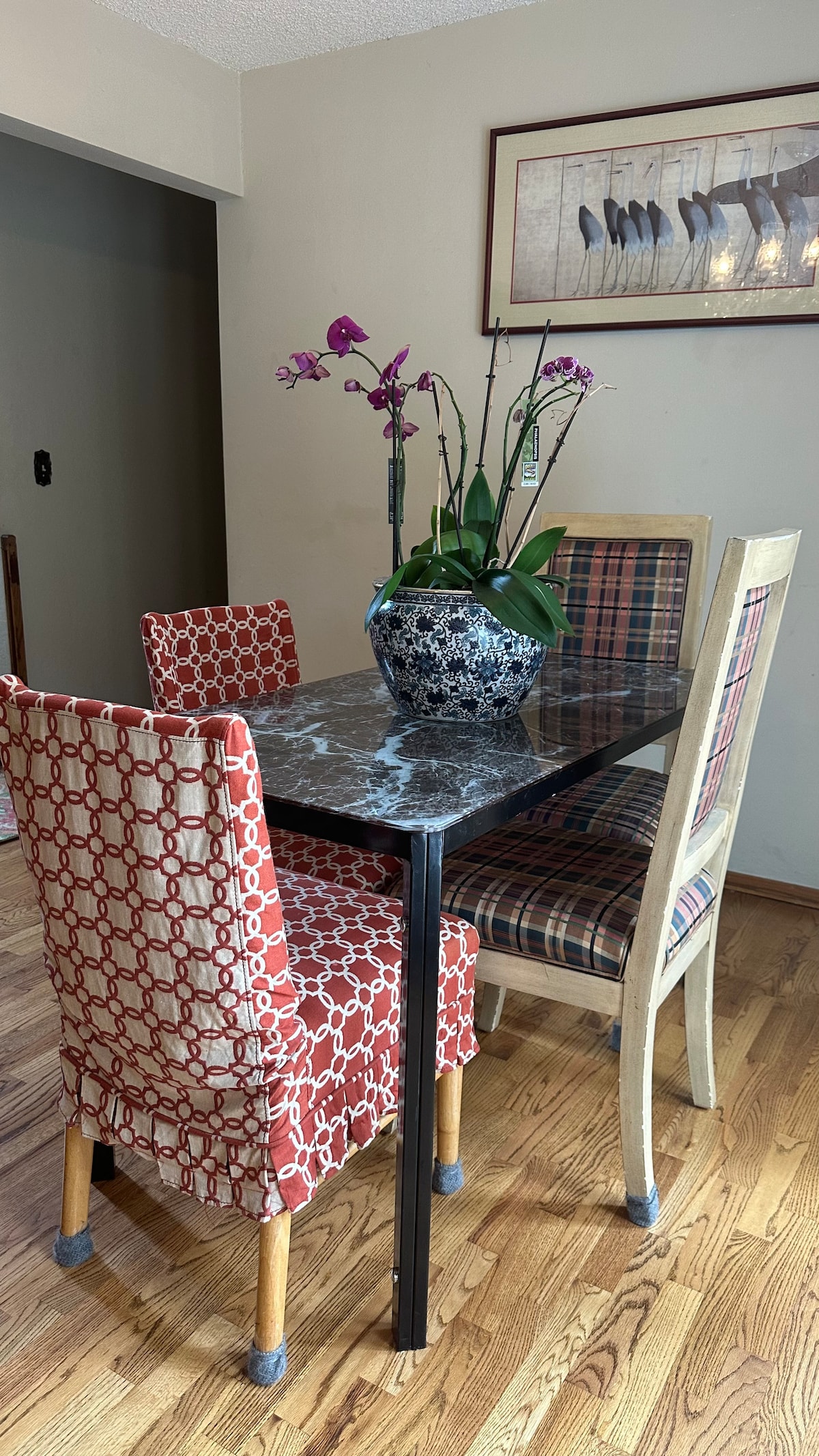 A large countertop has seating for four on stylish stools. Just off the kitchen is a sun room with a small table and four chairs for another dining option.