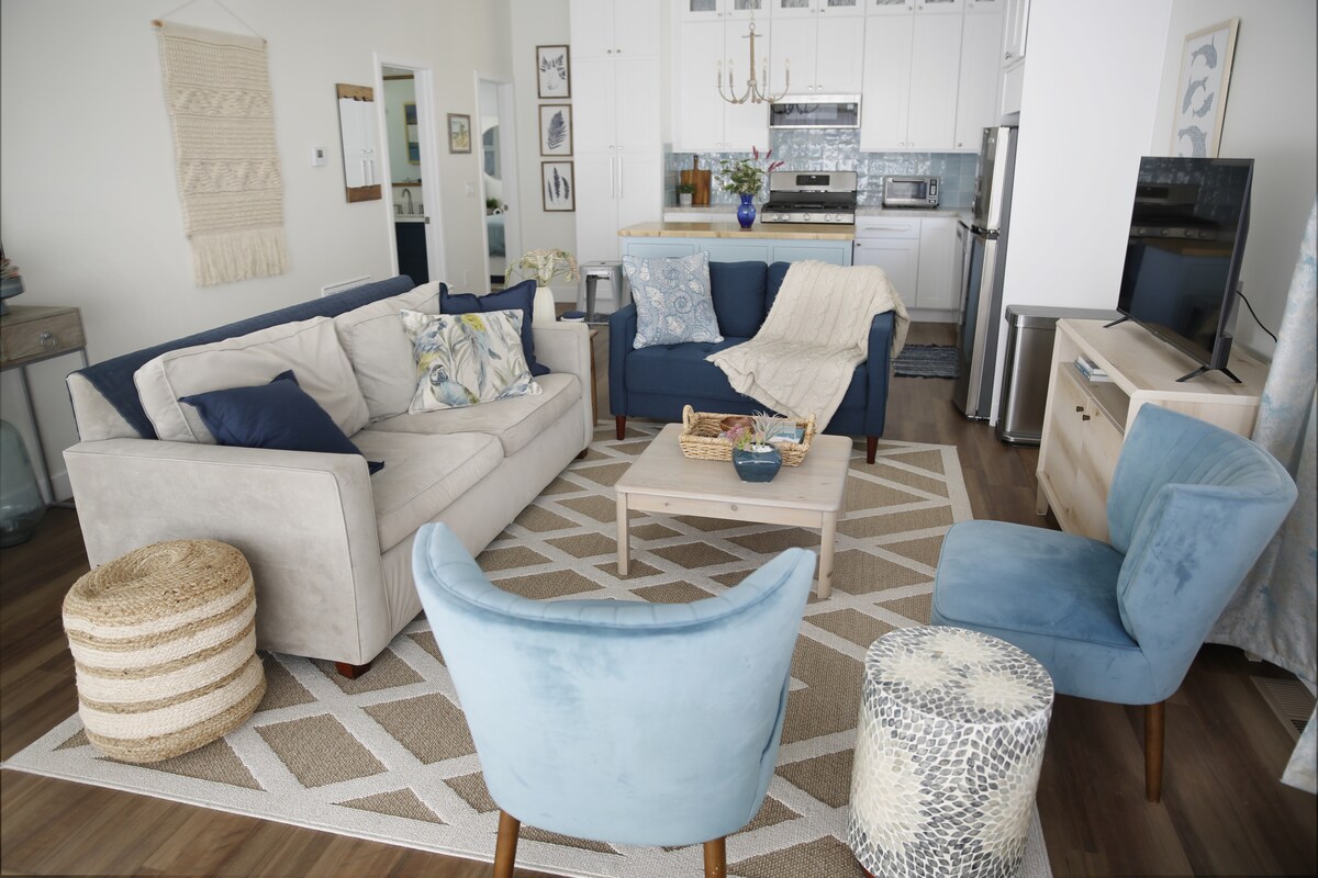 Walk in to an open concept living space, with a dedicated "drop zone", workspace, living space, and kitchen. The master bedroom features a king bed, large lighted closet, in-closet chest of drawers, nightstands with charging stations, and plenty of under-bed storage space. The second bedroom features two Room and Board twin-sized beds with under-bed storage drawers, a large lighted closet, an in-closet chest of drawers. The living area includes a CB2 queen-sized sleeper sofa for overnight guests. The kitchen has a brand new refrigerator, range, microwave, toaster oven, coffee maker, espresso machine, and washer/dryer combo unit.
