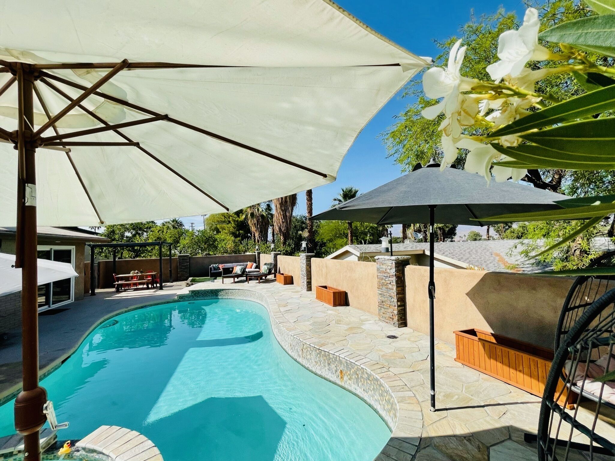 6.5 miles from Saks Fifth Avenue Palm Desert in Palm Desert, Sunny Palm Desert Escape on Golf Course offers accommodations with access to a hot tub. This property offers a pool with a view, free Wifi, and free private parking. Outdoor seating is also available at the vacation home. The air-conditioned vacation home consists of 3 bedrooms, a living room, a fully equipped kitchen with a dishwasher and a coffee machine, and 3 bathrooms with a walk-in shower and a hot tub. Towels and bed linen are featured in the vacation home. There's also a seating area and a fireplace. There is an on-site bar. Escena Golf Club is 15 miles from Sunny Palm Desert Escape on Golf Course, while Palm Springs Convention Center is 18 miles away. Palm Springs International Airport is 14 miles from the property.