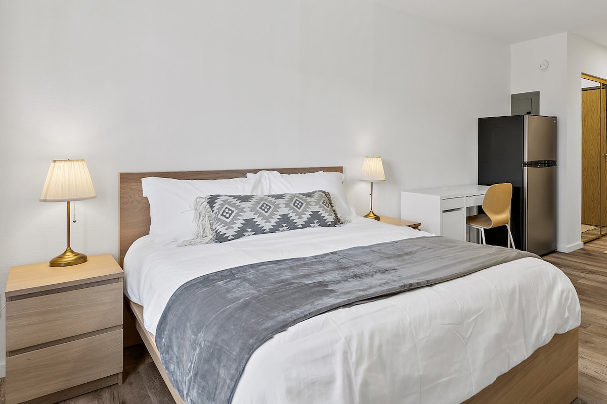 This stylish studio is your perfect home away from home. Unwind in comfort on a brand new (2024) Full mattress with plush pillows and a cozy comforter for a restful night's sleep. The well-equipped kitchen features modern amenities including a fridge, freezer, microwave, oven, electric stove, toaster, coffee maker, and a complete set of dishes and utensils for your culinary needs.