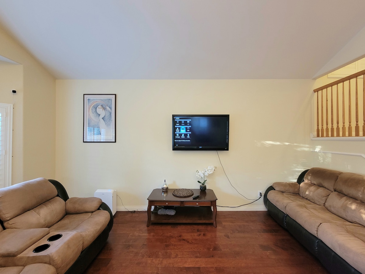 Please note that our gorgeous home does not have a traditional living room. The living area on the first floor consists of a charming kitchenette and cozy dining space. However, all bedrooms are equipped with large smart TVs and high-end comforts, ensuring you have a place to unwind during any time of day.