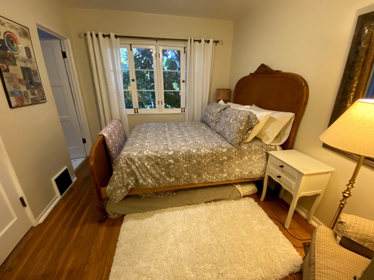 Ground-floor bedroom with a quality, full-size, Pottery Barn bed with Simmons mattress for one guest. Twin-size air mattress available by advance arrangement for one additional guest. Self-serve breakfast included. On-street parking included for a car. Sheltered parking included for a bicycle. Free WiFi. Limited use of kitchen and laundry. You can usually make breakfast with eggs from our backyard chickens if they are laying.