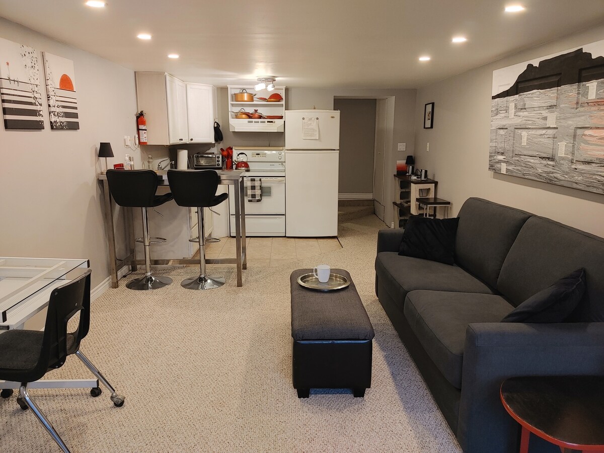 Bright, clean, quiet, private walkout basement studio with full kitchen and bathroom, pullout sofa for sleeping. Conveniently located north of downtown Peterborough close to Catharine Parr Traill College campus of Trent University and beside a recreational trail; walking distance to the river, downtown's bus station, grocery shopping. Car parking on street only.