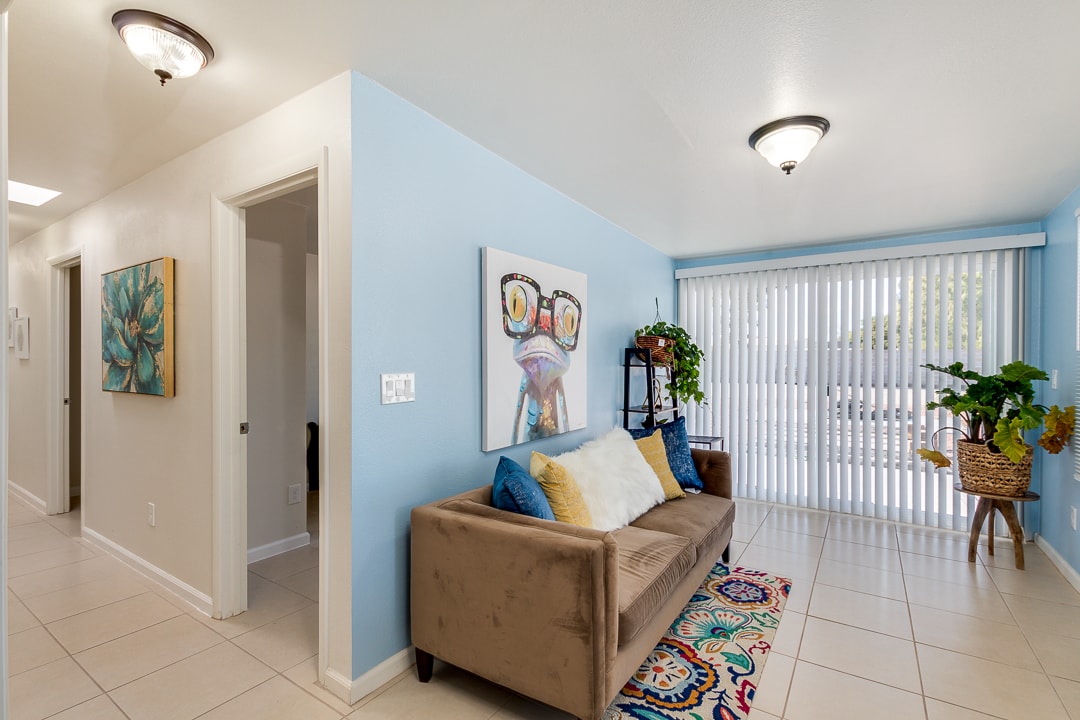 The private bedroom is 13 feet by 13 feet. Polished concrete floors in rooms. The living area is spacious. I am bringing in artwork to hang on the walls. We have a nice private Atrium Patio.