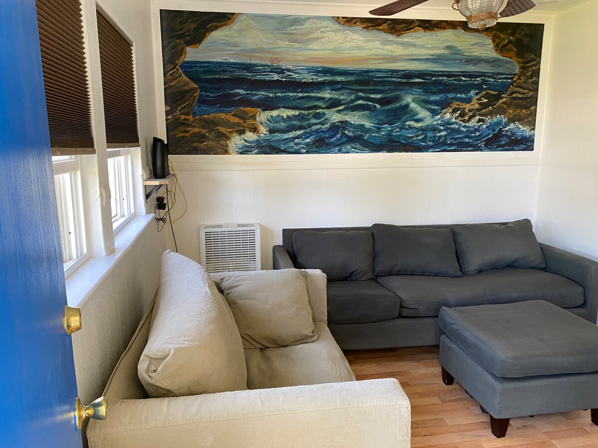 This is the largest unit in a triplex which has been recently renovated, while keeping some of its nostalgic details. there is a mix of new furniture and restored pieces, a new TV in the family room, and new queen size mattresses (with new linens, down comforters, and down pillows) in each room. King's Corner is 4 houses up from Ocean Blvd, the frontage road running bordering the Pacific Ocean. Views of the ocean are provided from the front yard and Eldwayen Ocean Park right at the end of the street. Dinosaur Caves Park is less than within a mile away.