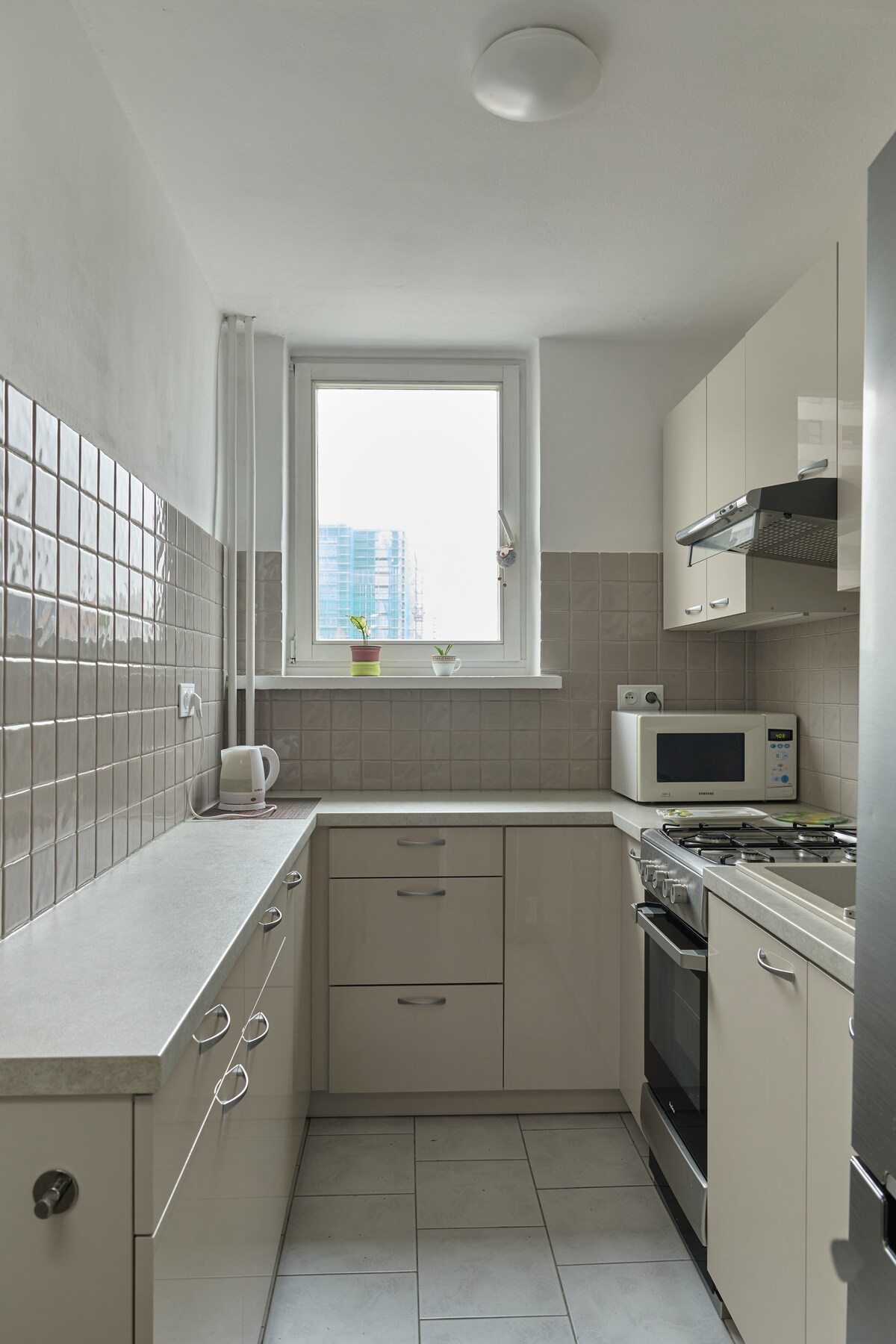 The kitchenette is equipped with a stovetop, a refrigerator, an electric kettle, and cookware. Bathroom amenities include a hair dryer and towels. And there's a washing machine, so you can even pack a bit lighter. Other amenities include bed sheets, an ironing board, heating, and wardrobe or closet.