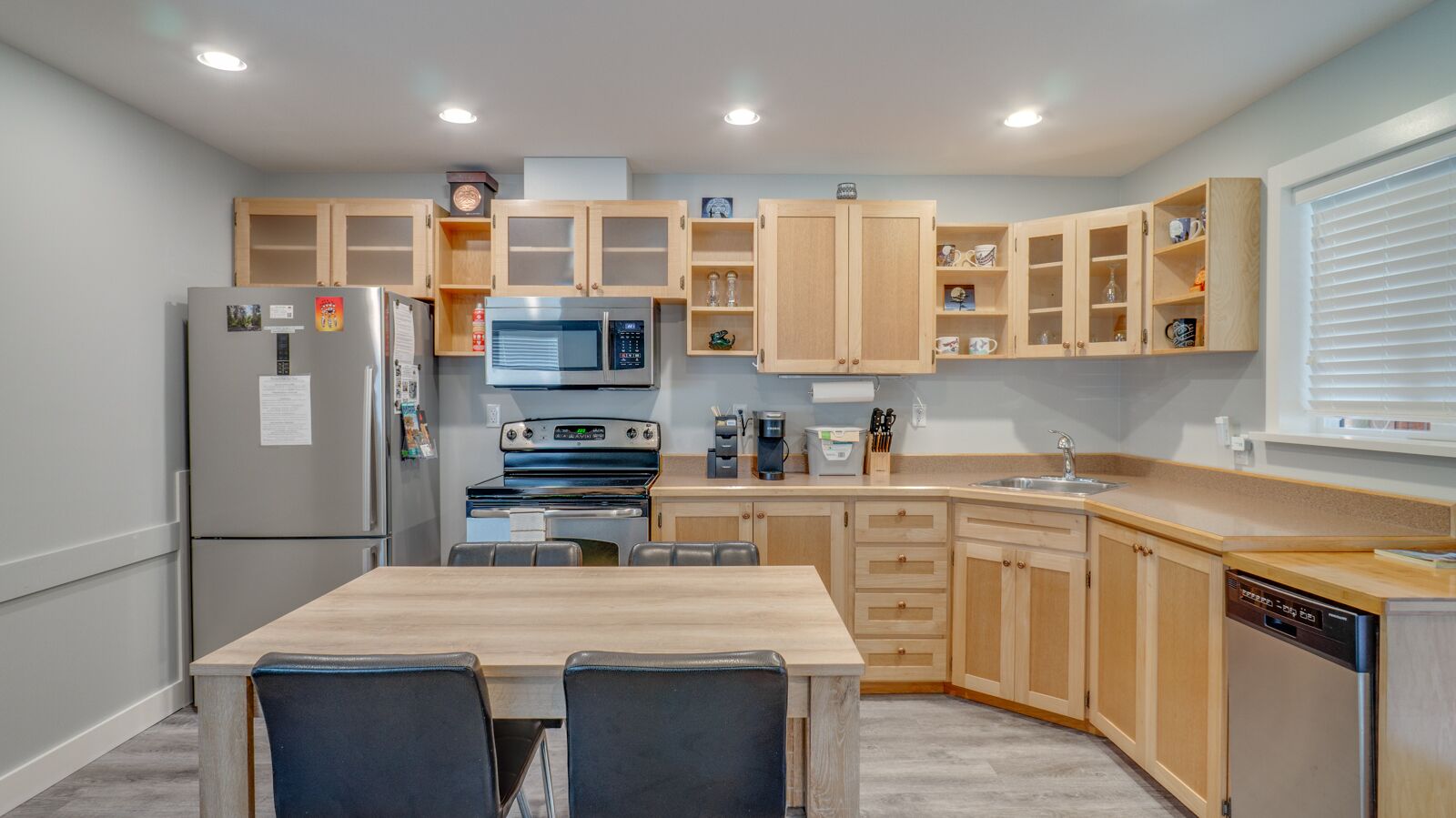The front door opens into a multipurpose area that serves as an entryway, kitchen, dining area, living room and office. The kitchen is fully equipped and stocked to be your culinary home away from home. It features brand new full size appliances, a microwave, toaster, blender, and all of the essentials for your morning coffee.
