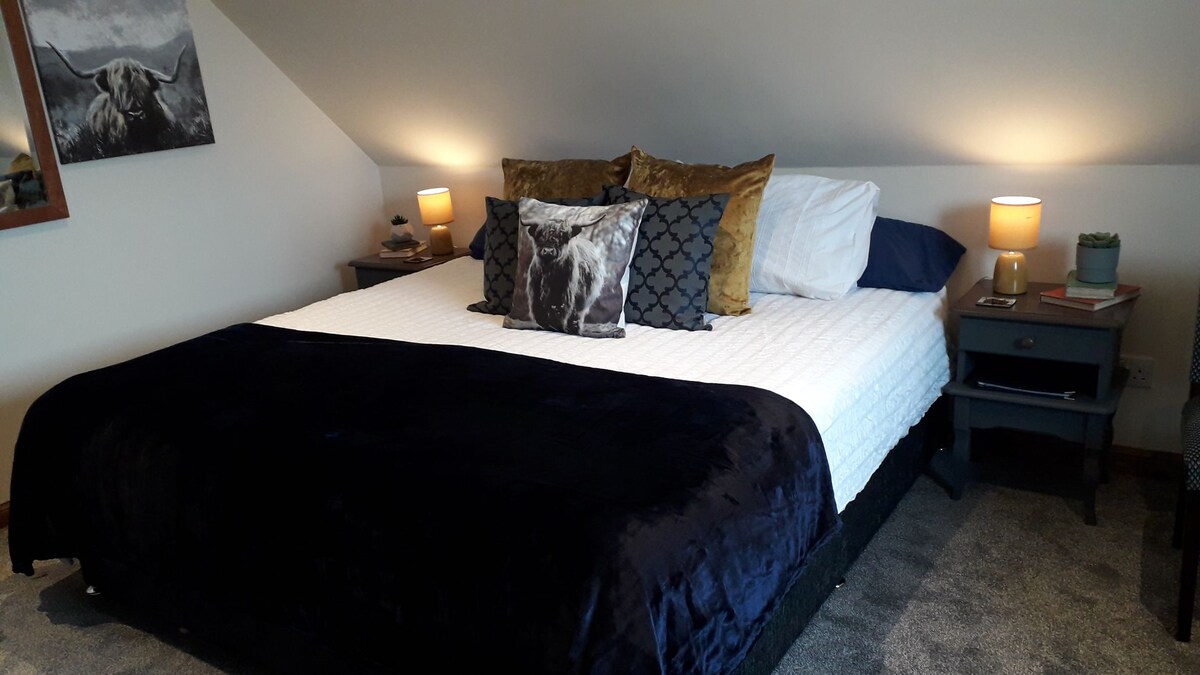 Bedroom 1 - The ground floor offers access to a double bedroom with jumbo window and stunning Cuillin mountain range vistas. Waking up with this view is like no other and you can relax in the super luxurious bedding and take it all in.