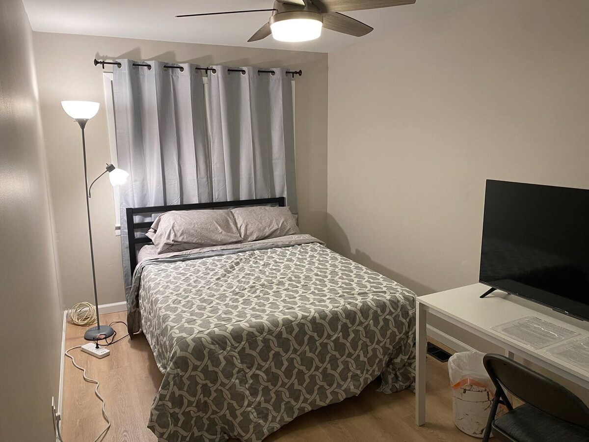 Enjoy a private bedroom with a Queen/Full Bed, Dresser, Desk, Lamp, and 43” Smart TV. The house features a 60” Smart TV in the living room and includes 3 renovated shared bathrooms.