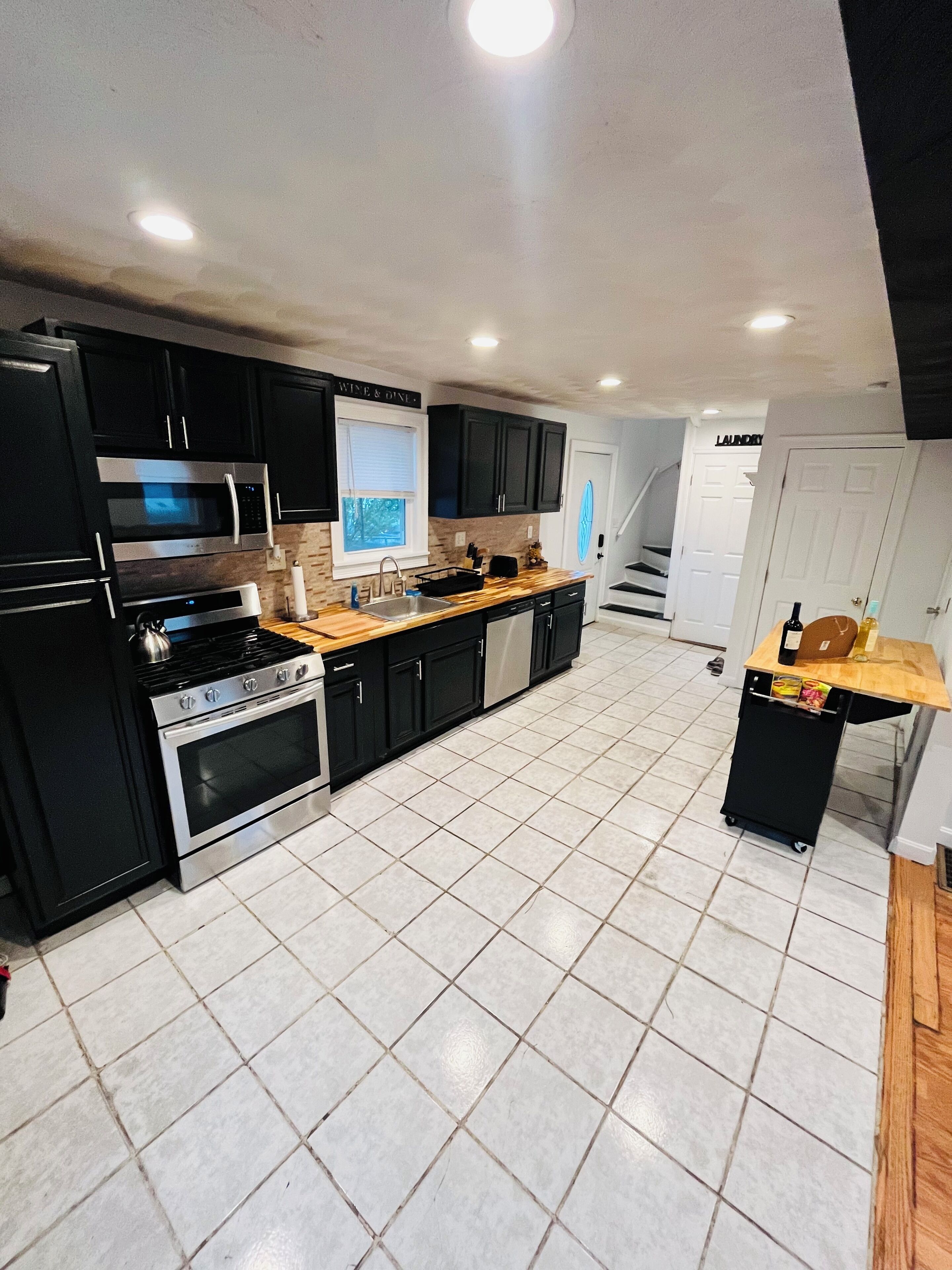 Step inside and be greeted by a bright, thoughtfully designed kitchen that instantly feels like home. This inviting space features white cabinetry, smooth countertops, and an island with bar stool seating. Just alongside, a dining table seats six comfortably. There is a full suite of stainless steel appliances; including a full-size refrigerator, stove, microwave, and dishwasher—make cooking & meal prep feel effortless. Whether you're preparing a quick breakfast or a full dinner, you'll find all the essentials: cookware, utensils, dishes, glassware, and even a coffee maker to start your morning right.