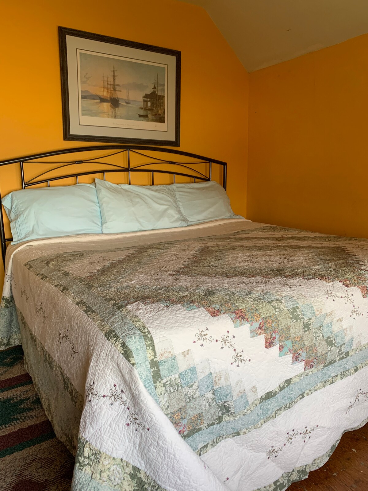 Nettie's Room is upstairs through the downstairs living room, kitchen, and breakfast cafe. It is a spacious bedroom with a queen sized bed. It comes equipped with a mini fridge, microwave, and coffee maker. A rollaway bed for 1 can be added for an additional nightly cost. The bathroom is adjacent to the room. You can see the exposed brick from the chimney in one area. The windows view the side yard and the front view of the street and through the trees to the lake.