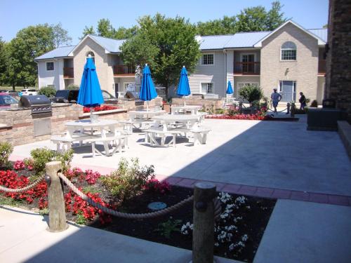 Shared amenities include the ground-level patio, picnic tables, gas grills, parking lot (one car per condo), and the pool area. The property is lakefront, located behind the airport, offering stunning views of Lake Erie.