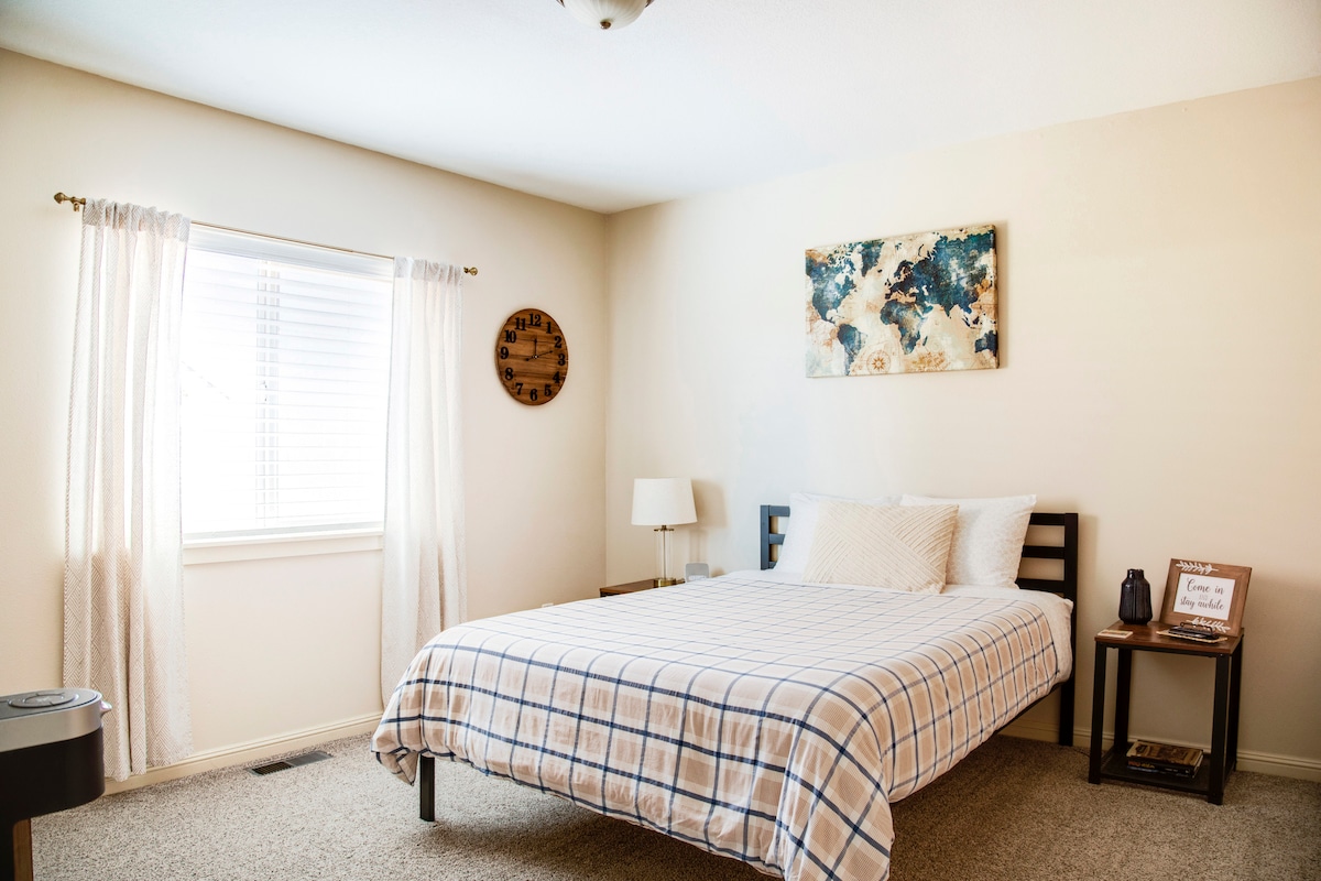 Bedroom: The bedroom is a private room inside our home and is located at the end of the hallway on the right. It has a queen memory foam mattress, full closet, iron, air purifier, Keurig, dishes, and a TV with local channels and streaming options of Netflix, Hulu, and Amazon Video.