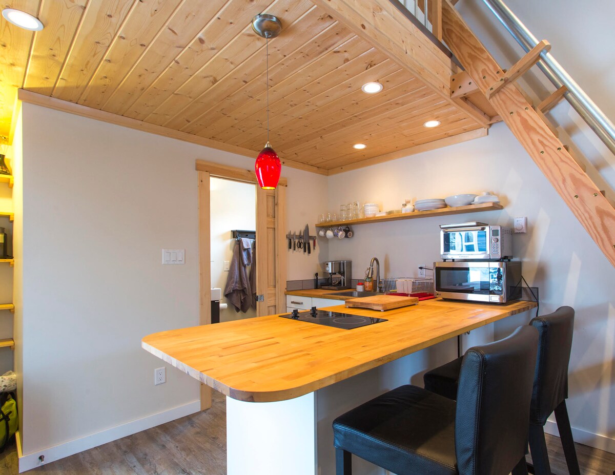 Private entrance, separate building with self check in an dedicated fibre internet just for your suite! At just under 200 sq ft, this is your chance to stay in a tiny house that doesn't feel all that tiny! With a queen size bed, kitchen with fridge, microwave, hotplate, sink and full compliment of dishes, cutlery, and cooking utensils you will feel right at home. Only 4 minutes to the gondola by car, and access to lockable bike/ski tuning and storage room is included.