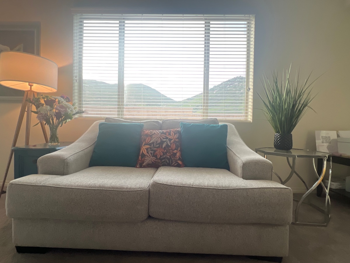 We are literally at the base of Little Sugarloaf mountain. Very close to UCR Botanic gardens, the famous Mission Inn and Mt. Rubidoux. Riverside is the "Smartest, Greenest and Coolest" downtown (as voted in the most recent years). There is a single bedroom (for one person) with TWO lovely full shared bathrooms.