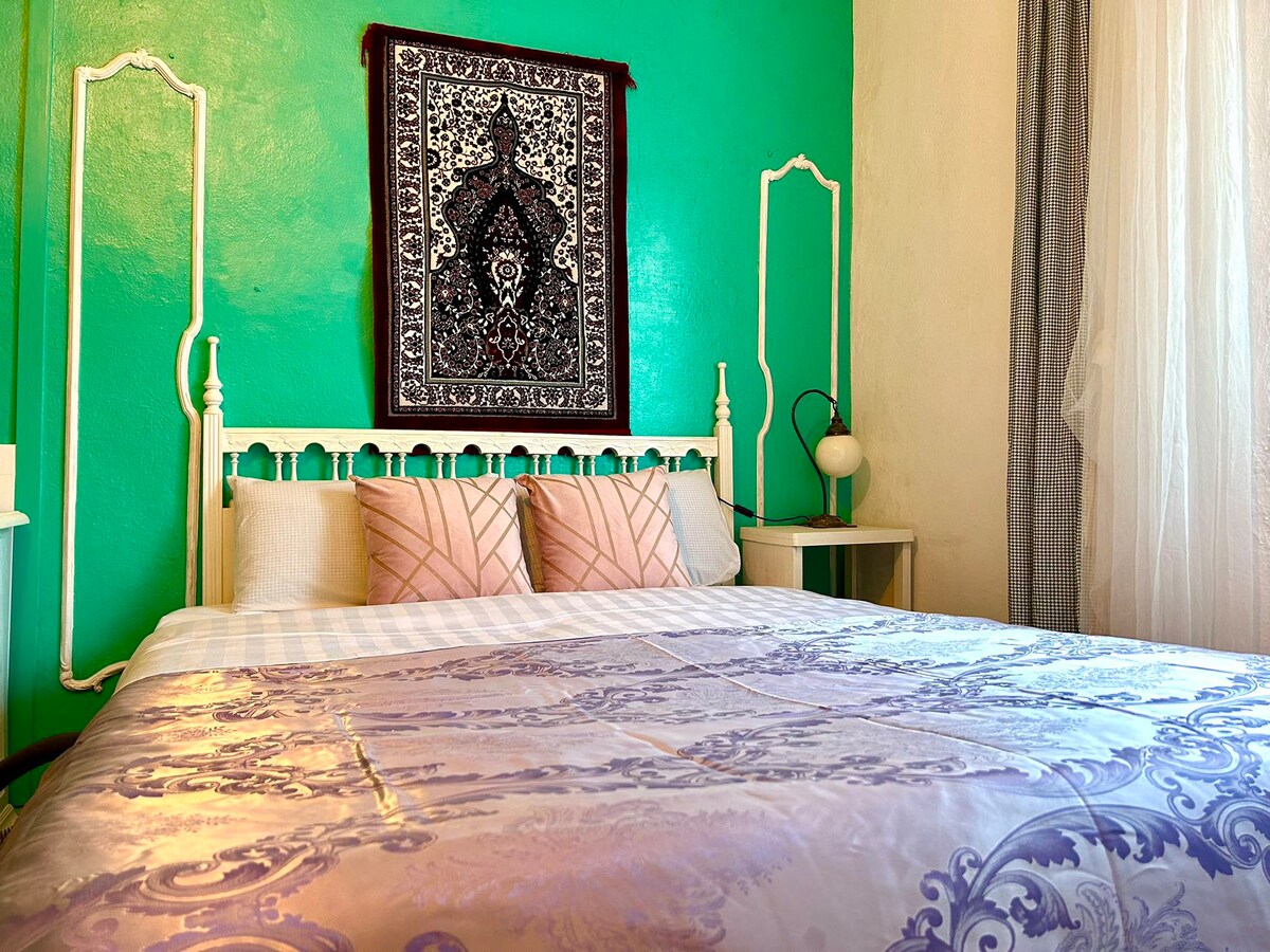 A spacious and bright room with a double bed, wardrobe and drawers with balcony and window overlooking the street. Suitable for couples.