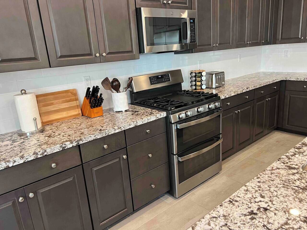 The well-appointed kitchen boasts a complete range of appliances and ample countertop space. All necessary utensils and cookware are provided for your convenience. Also included is a toaster, air-fryer, and Keurig duo coffeemaker with your choice of k-cups or to brew a pot.