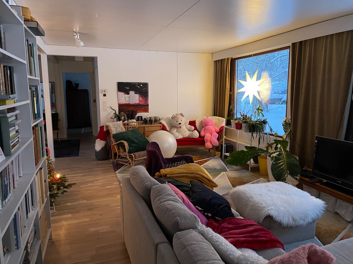 Renovated (Pictures of the kitchen updated), spacious and cozy apartment in a peaceful neighborhood, 5km from the center of Rovaniemi. The apt has a bedroom with a comfortable queen-sized bed, a spacious living area with a full kitchen and a sofa-bed, as well as a loft area. We can be easily reached since we live in the same building, and we are happy to help with anything. The area is quiet and close to nature, with a beautiful lake nearby.