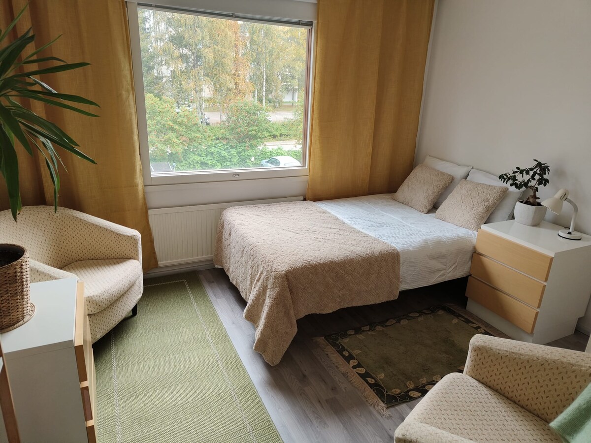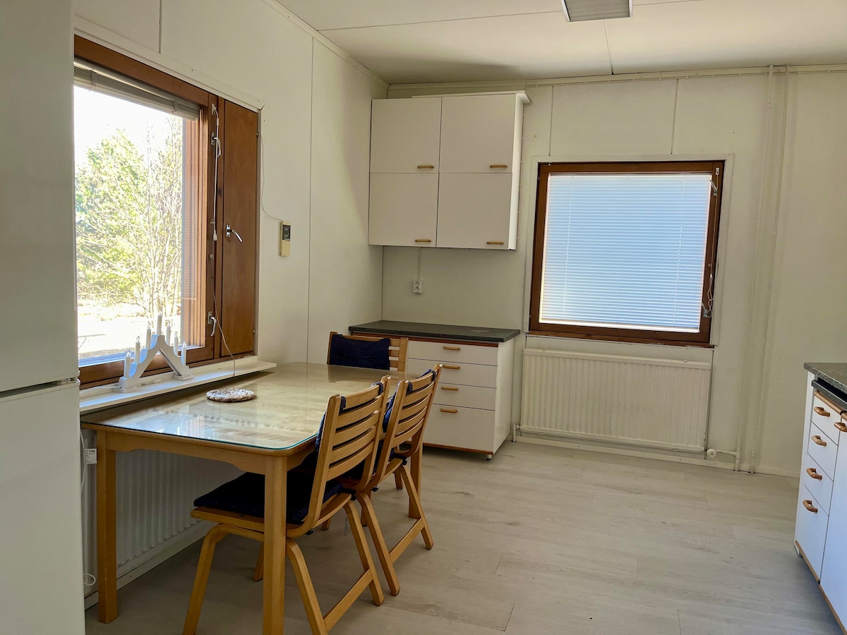 Apartment attached to a host house. You will have your own entrance and privacy. Your side has toilet,shower and sauna. There is no kitchen but have air fryer,refrigerator,micro way,coffee machine and electric kettle, so can prepare simple meals. Sauna is wood heated and can be used free of charge. Also possibility to park in warm garage.Located 3km from city center. Within few hundred meters have grocery store,bus stop and ski trail. You can use our skate,skis and sled free of charge.