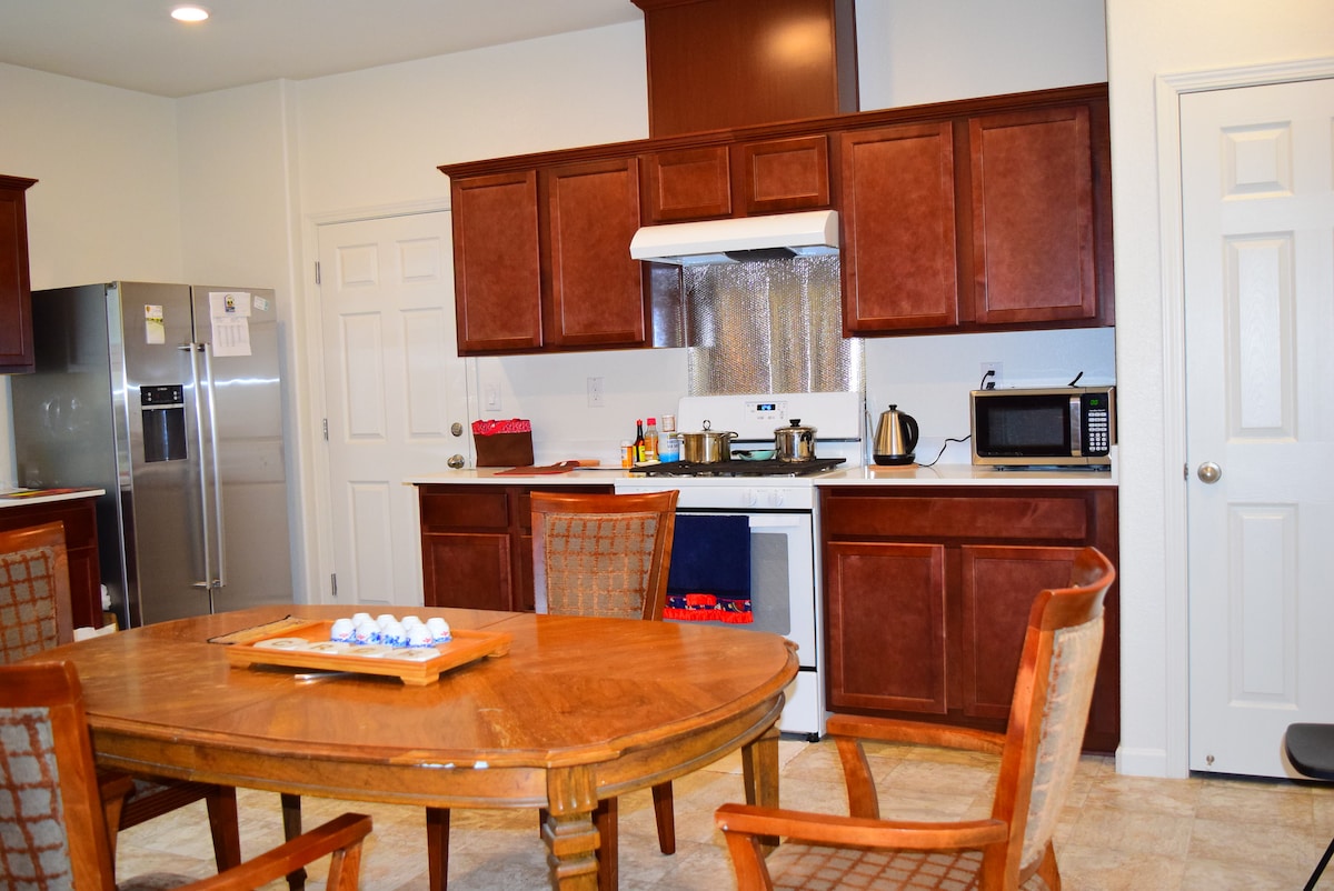 You will have access to the shared kitchen. There is a medium sized refrigerator, gas stove, dishwasher, garbage disposal, toaster oven, microwave, rice maker, grill, and drip coffee maker. Bring your own coffee. The kitchen is fully equipped with pots, pans, dishes, utensils, towels, etc. You will be provided a dedicated kitchen cabinet, extra-large pantry shelf, and a dedicated refrigerator shelf for your personal food storage. There is a private mini refrigerator in your bedroom for additional cold food storage. Oil, salt & pepper is provided. Eating and storing food is not allowed in the bedroom, other than in the mini fridge.