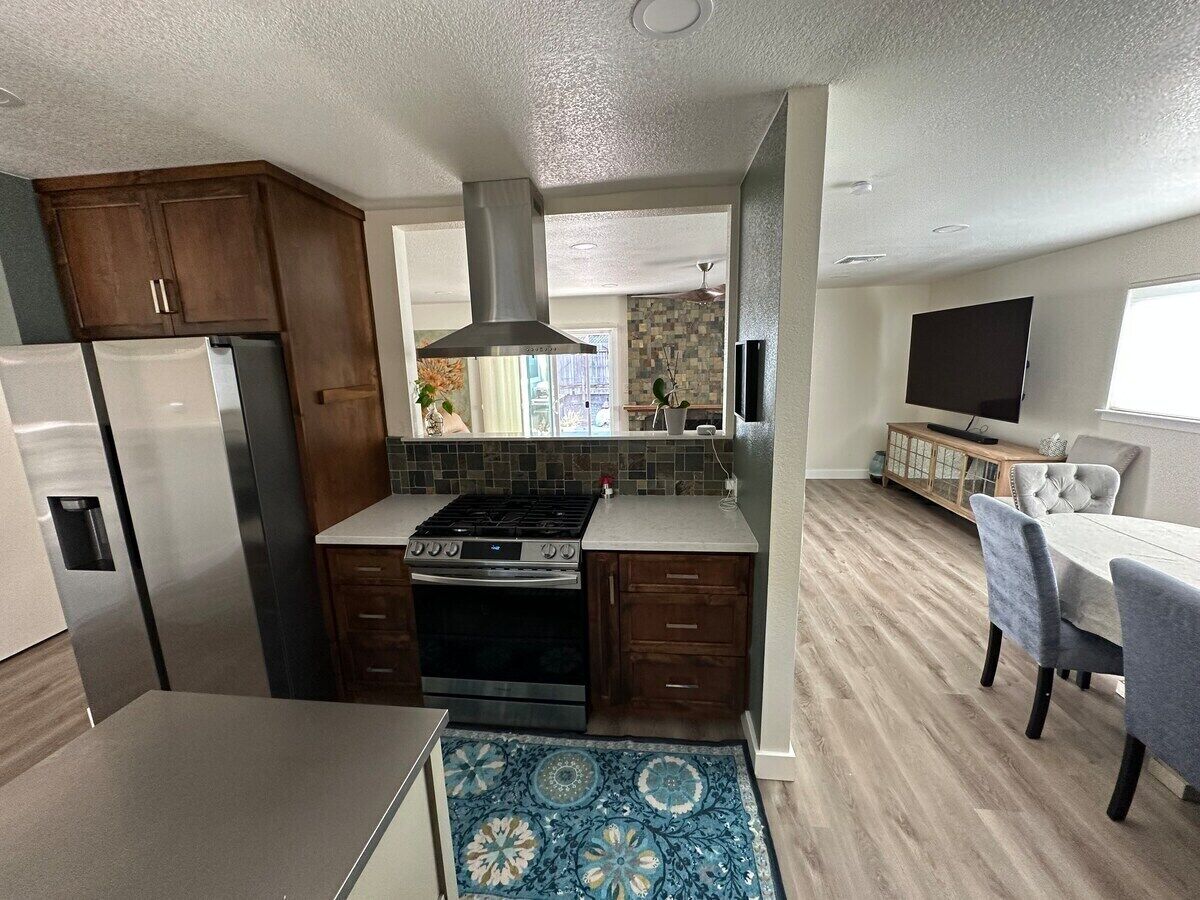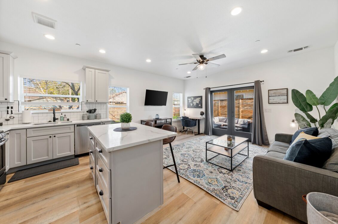 INTERIOR: 1 Smart TV with all major streaming apps like Netflix & Hulu, open-concept living area, and large family-style dining table