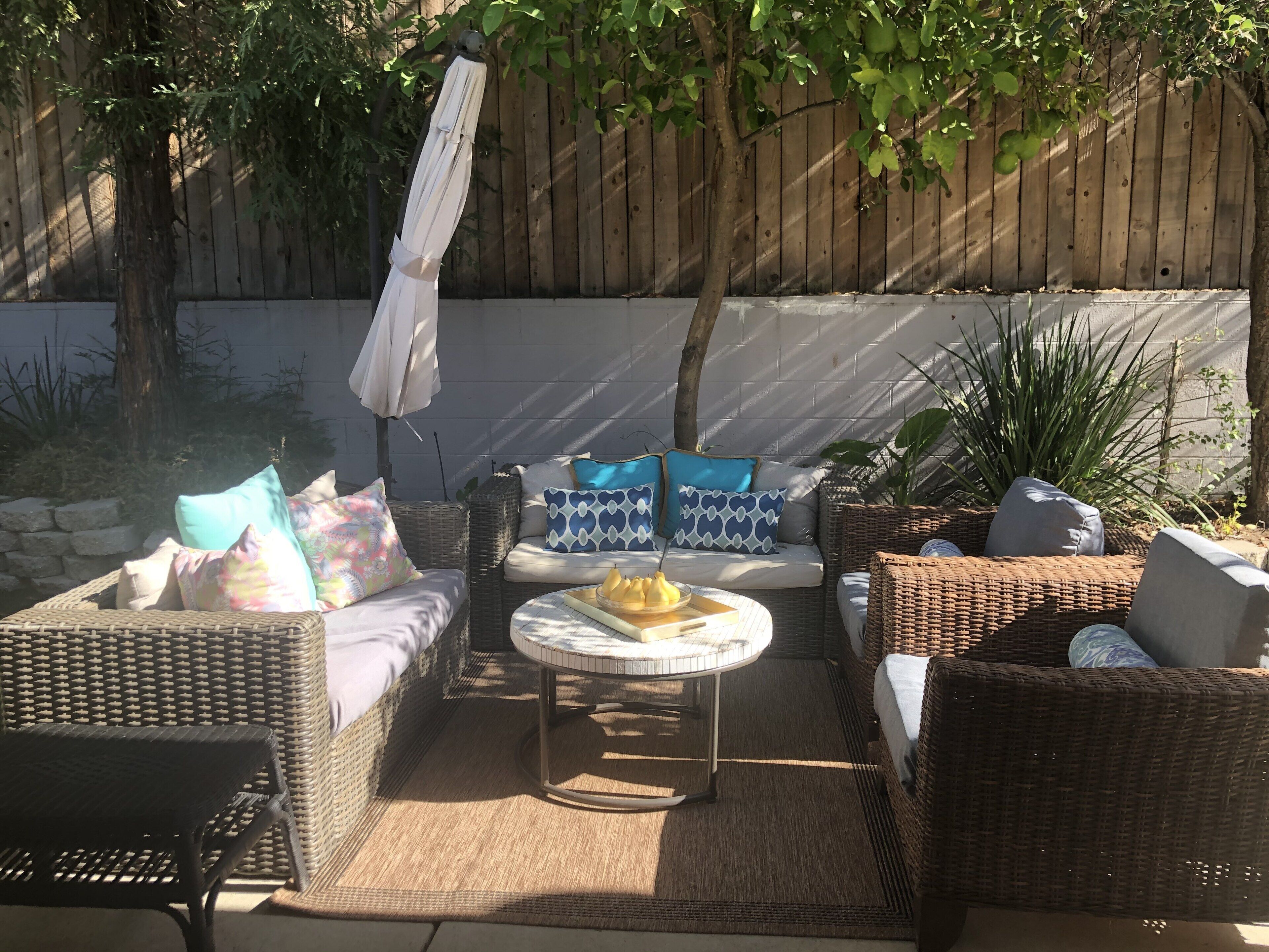 Large outside Patio with furnished chairs, couch, bbq, tables, and more.