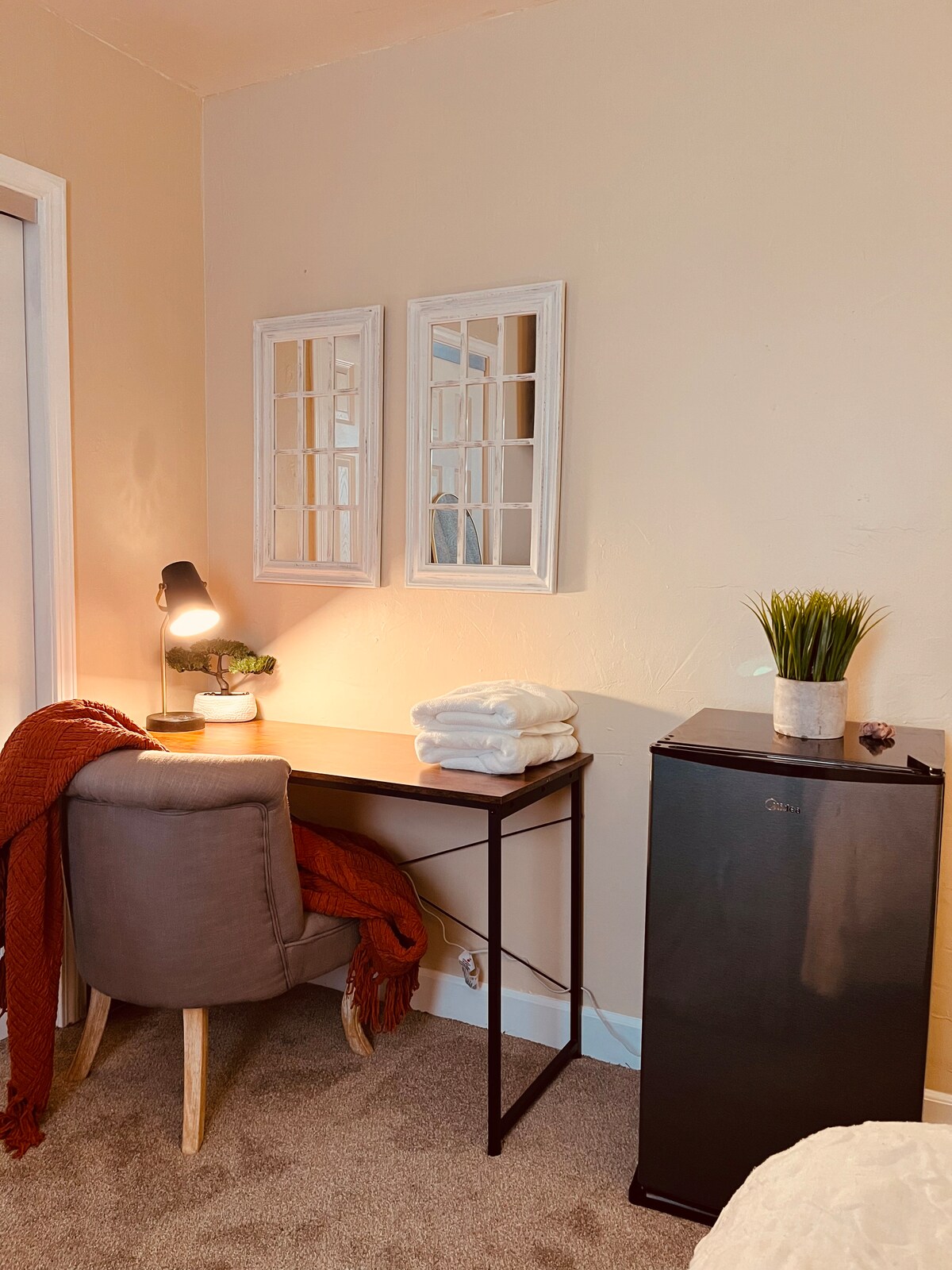 Beautiful private bedroom, perfect for a relaxing getaway. Enjoy the the comfort of your own mini fridge, with access to a shared restroom. Guests are welcome to use the household microwave and coffee machine. Kitchen use is not included, though arrangements can be made for an additional fee.
