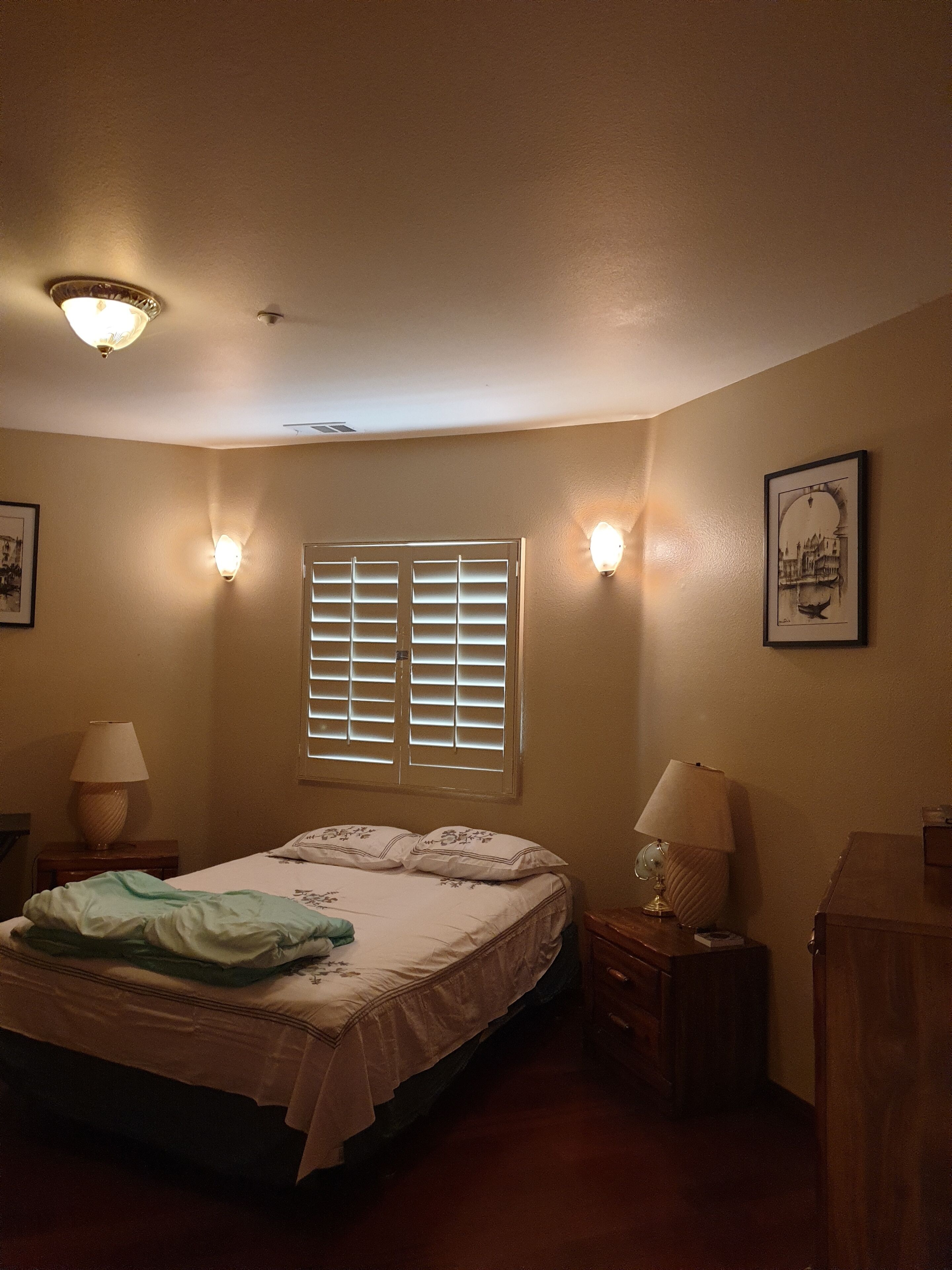 Travel professionals welcome. Retreat to a comfortable, stylish room, peaceful, relaxing with lots of natural light. Also has a window shade with blackout curtains, with view of mountains. Comfy, full size bed with memory foam mattress, ceiling fan w/remote to keep you cool, 32 in smart Roku TV to stream movies, includes a mini frig and microwave, lots of closet space, blanket, towels and linen provided. Close to Kaiser Fontana, Loma Linda, Arrowhead hospitals, shopping, frwys.
