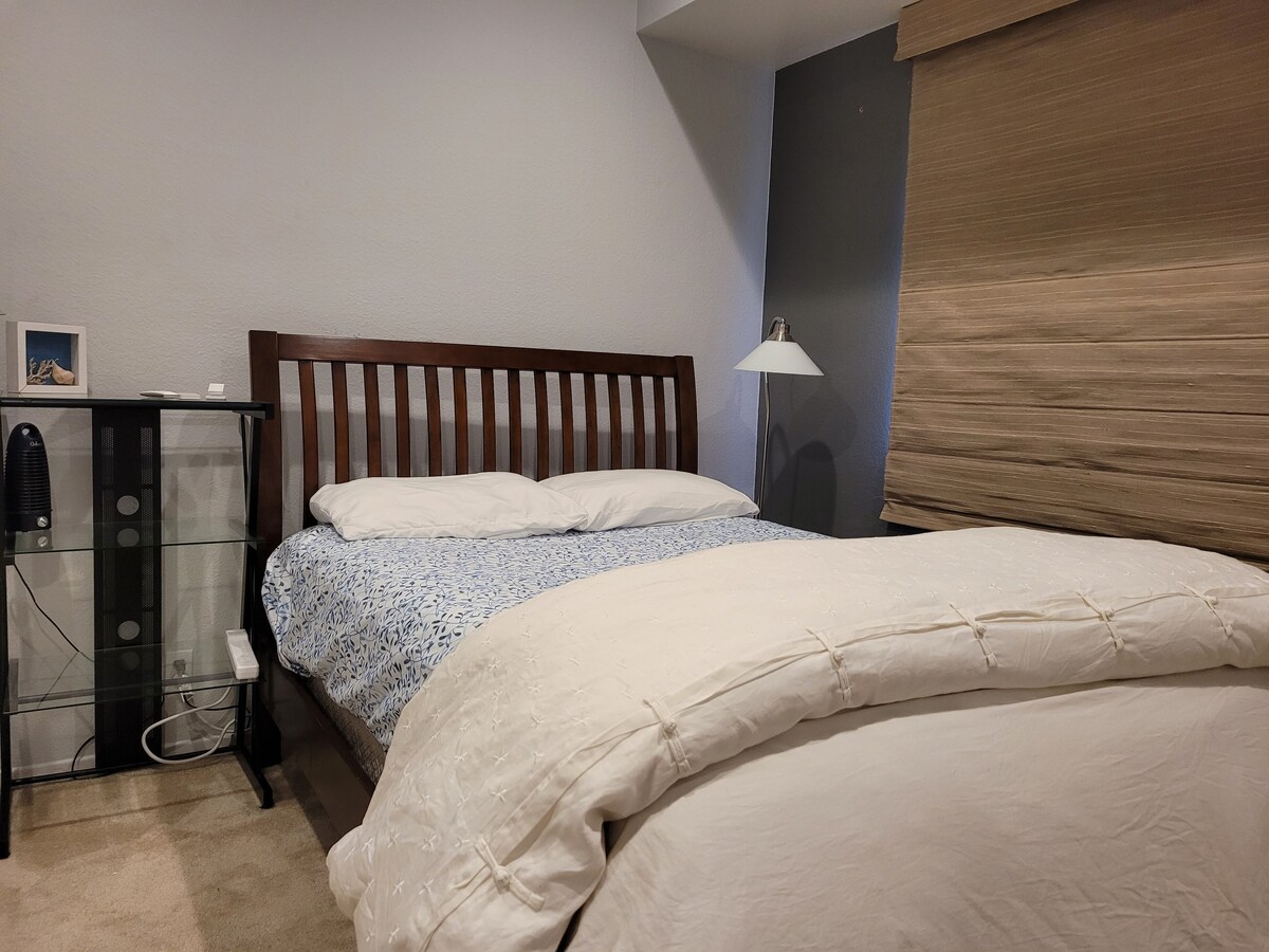 The room is furnished with a queen size bed, open closet, smart TV, small desk, iron/board and fast WiFi.