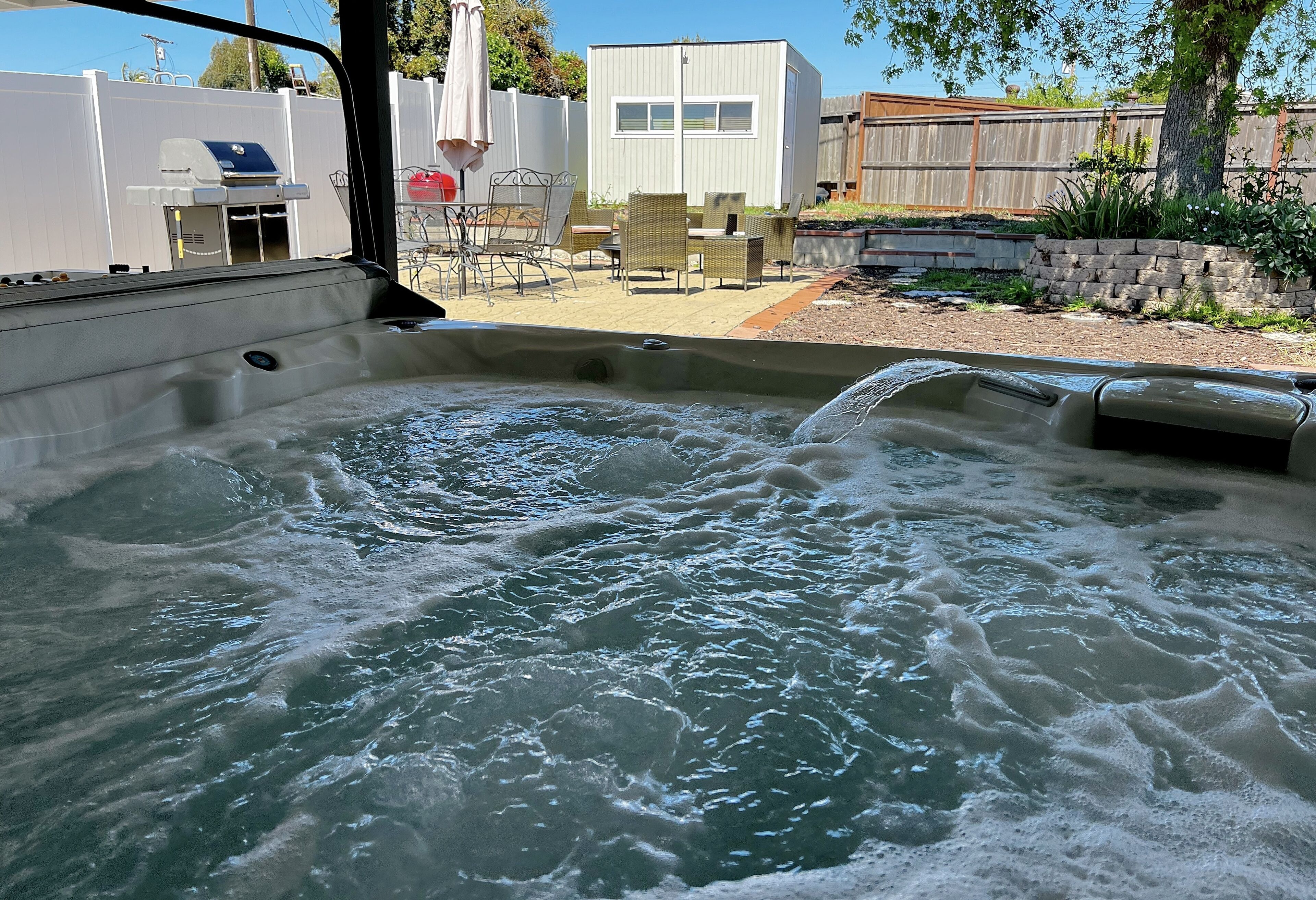 While you're here, you can enjoy all the comforts of home and more, including an outdoor spa tub and a full-sized refrigerator/freezer, as well as an oven and a stovetop. Other amenities include laundry facilities, a freezer, towels, and an ice maker.