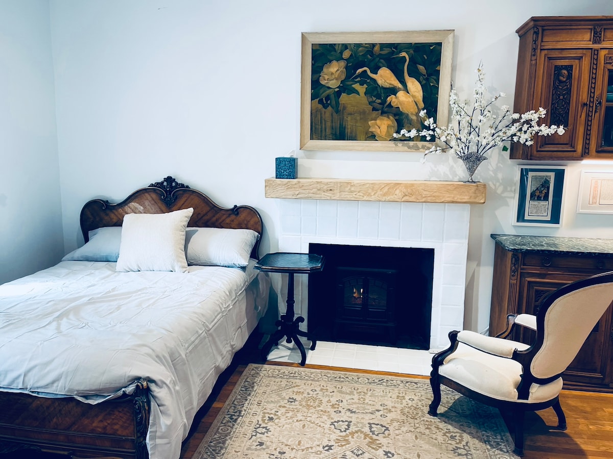 Private room for one in serene and relaxed household, quiet, clean and well appointed. Queen Bed with closet, with shared tub-shower bathroom. Fun 1890s Craftsman decorated with spicy colors, fun artwork and plenty of love! Dogs are welcome, but sorry, no pee pads, unfixed dogs or cats. Rosie my sweet-natured lab mix bit shy but loves dogs. I am the only one living here so guests enjoy lots of space and freedom.