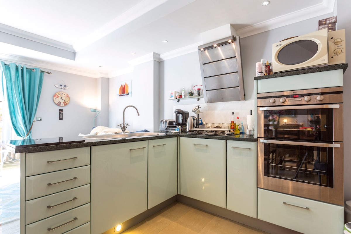 Belle Vue, Napoleons Landing is a contemporary, three-bedroom waterfront apartment, located on the seventh floor with panoramic views of Sandown and Shanklin Bay. The apartment has an open layout with sea views from the kitchen/dining room, living room, master bedroom and balcony making it the perfect coastal retreat with a view of the sandy beach and the passing ships and cruise liners on the horizon. The kitchen/dining room is well-equipped, with a contemporary finish and plenty of seating with the option to enjoy your morning coffee at the breakfast bar or have a leisurely breakfast at the dining table.
