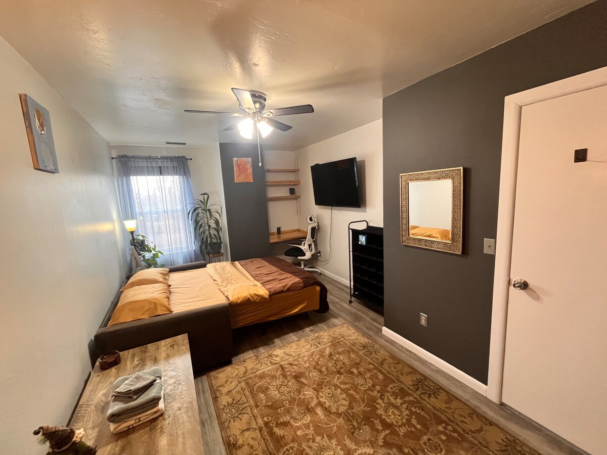 Comfortable, clean space with bathroom right across the hallway. Room has a queen bed, desk for work, and a TV with Netflix. Mini fridge, microwave and toaster is the down the hall for guest use. Maximum allowed is 2 guests. Space is not set up for children.
