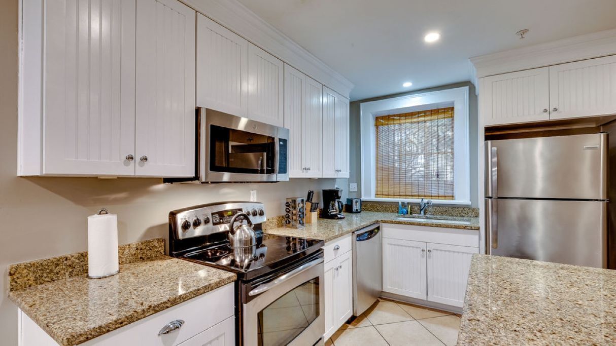 Fully equipped with modern cooking appliances and suitable for preparing any meal, whether it is a simple breakfast, quick snack, or a gourmet dinner. Spacious granite countertops and a central kitchen island provide plenty of space to work your MasterChef magic: