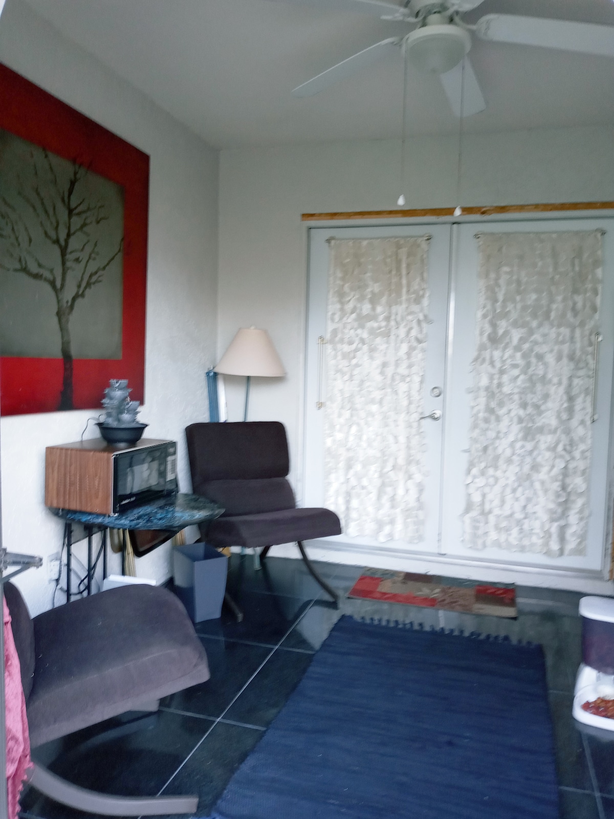 this master suite is connected to a small house and a residential area in a quiet neighborhood across the street from a state park. perfect place for someone who does not require a full kitchen or living room just a refrigerator, coffee pot & microwave with a sweet little sitting area outside the bedroom in the screened zen room. Please check all the additional notes about this listing because we do have a dog and a cat if you’re allergic