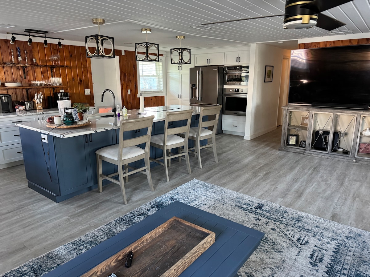 INDOOR LIVING: 3 Smart TVs, desk area, 4-person dining table, ceiling fans
