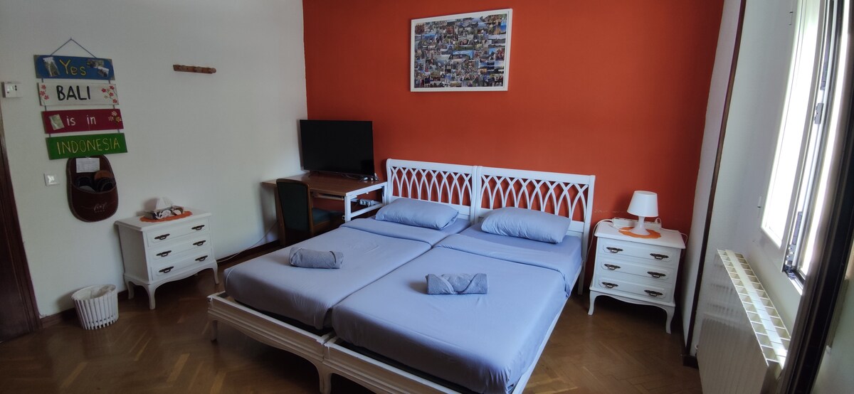 The room offers two comfortable double single beds, heating for the winter and good ventilation for the summer, plus a television with access to some streaming platforms. We offer high speed Wi-Fi internet.